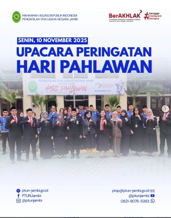 Senin, 10 November 2025 — Pengadilan Tata Usaha Negara (PTUN) Jambi melaksanakan Upacara Peringatan Hari Pahlawan yang berlangsung dengan khidmat