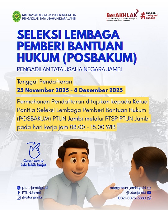 Pengadilan Tata Usaha Negara Jambi menyelenggarakan Seleksi Lembaga Pemberi Bantuan Hukum (Posbakum) untuk Tahun Anggaran 2026 sebagai bagian dari upaya