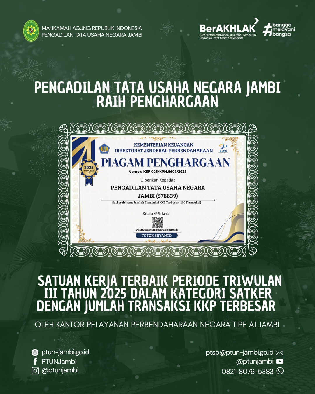 Dengan penuh rasa bangga dan apresiasi, Pengadilan Tata Usaha Negara Jambi mengumumkan pencapaian membanggakan berupa 𝗣𝗶𝗮𝗴𝗮𝗺 𝗣𝗲𝗻𝗴𝗵𝗮𝗿𝗴𝗮𝗮𝗻 yang diberikan oleh 𝗞𝗲𝗺𝗲𝗻𝘁𝗲𝗿𝗶𝗮𝗻 𝗞𝗲𝘂𝗮𝗻𝗴𝗮𝗻 𝗗𝗶𝗿𝗲𝗸𝘁𝗼𝗿𝗮𝘁 𝗝𝗲𝗻𝗱𝗲𝗿𝗮𝗹 𝗣𝗲𝗿𝗯𝗲𝗻𝗱𝗮𝗵𝗮𝗿𝗮𝗮𝗻.