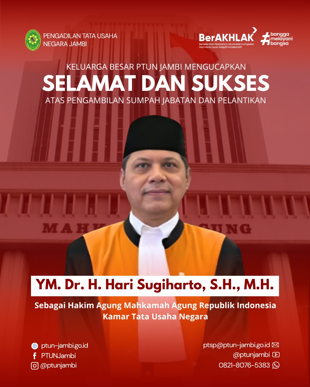 Semoga Yang Mulia senantiasa diberi kesehatan, keteguhan, dan kebijaksanaan dalam mengemban amanah ini serta membawa Mahkamah Agung Republik Indonesia untuk semakin mampu menjaga martabat peradilan, memperkuat integritas kelembagaan, serta mewujudkan peradilan yang agung, profesional, transparan, dan berkeadilan bagi seluruh rakyat Indonesia.
