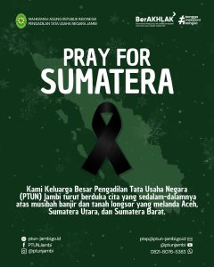 Pengadilan Tata Usaha Negara Jambi turut menyampaikan duka cita yang sedalam-dalamnya atas musibah banjir dan tanah longsor yang melanda wilayah Aceh, Sumatera Utara, dan Sumatera Barat. Semoga para korban serta keluarga yang terdampak diberikan ketabahan, kekuatan, dan keselamatan. Kami juga berharap proses penanganan dan pemulihan di daerah terdampak dapat berjalan dengan cepat dan lancar, sehingga masyarakat dapat kembali memperoleh rasa aman serta harapan di tengah kesulitan yang dihadapi.