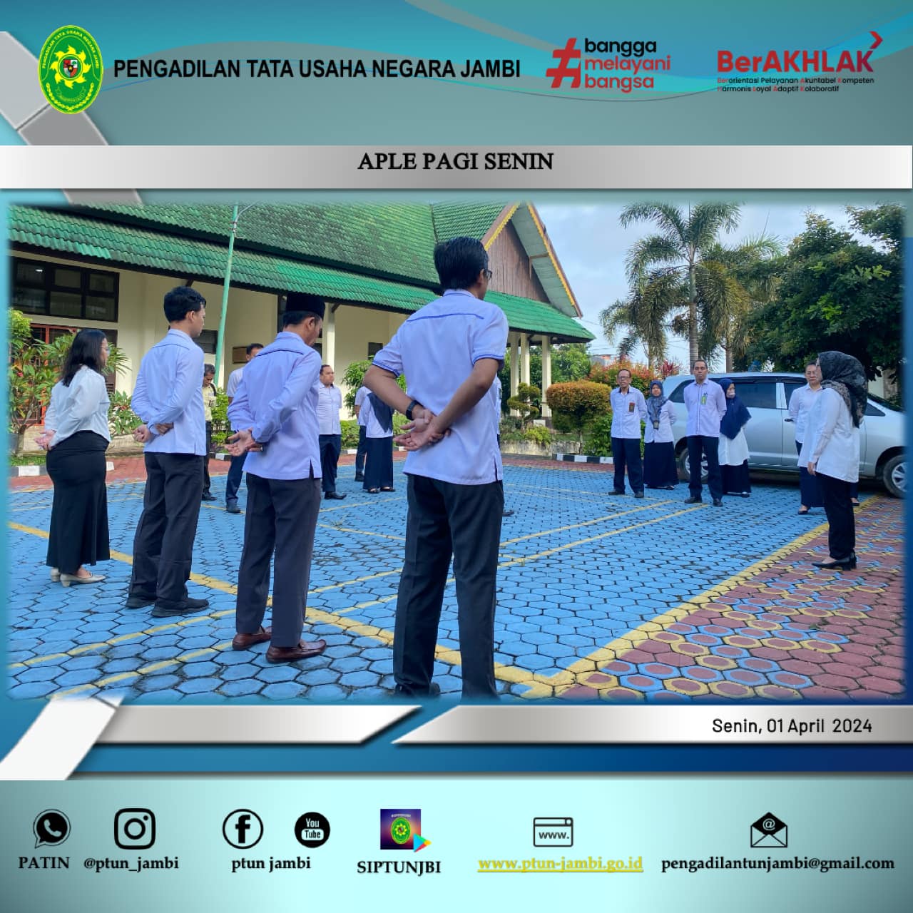 Pengadilan Tata Usaha Negara Jambi Melaksanakan Apel Pagi Senin. Dalam Apel Pagi ini Hakim Pengadilan Tata Usaha Negara Jambi yang bertindak sebagai Pembinan Apel, Ibu Lailaturrahmah, S.H. Pemimpin Apel Pagi Saudara Dede Febrizal Rachman, S.H.