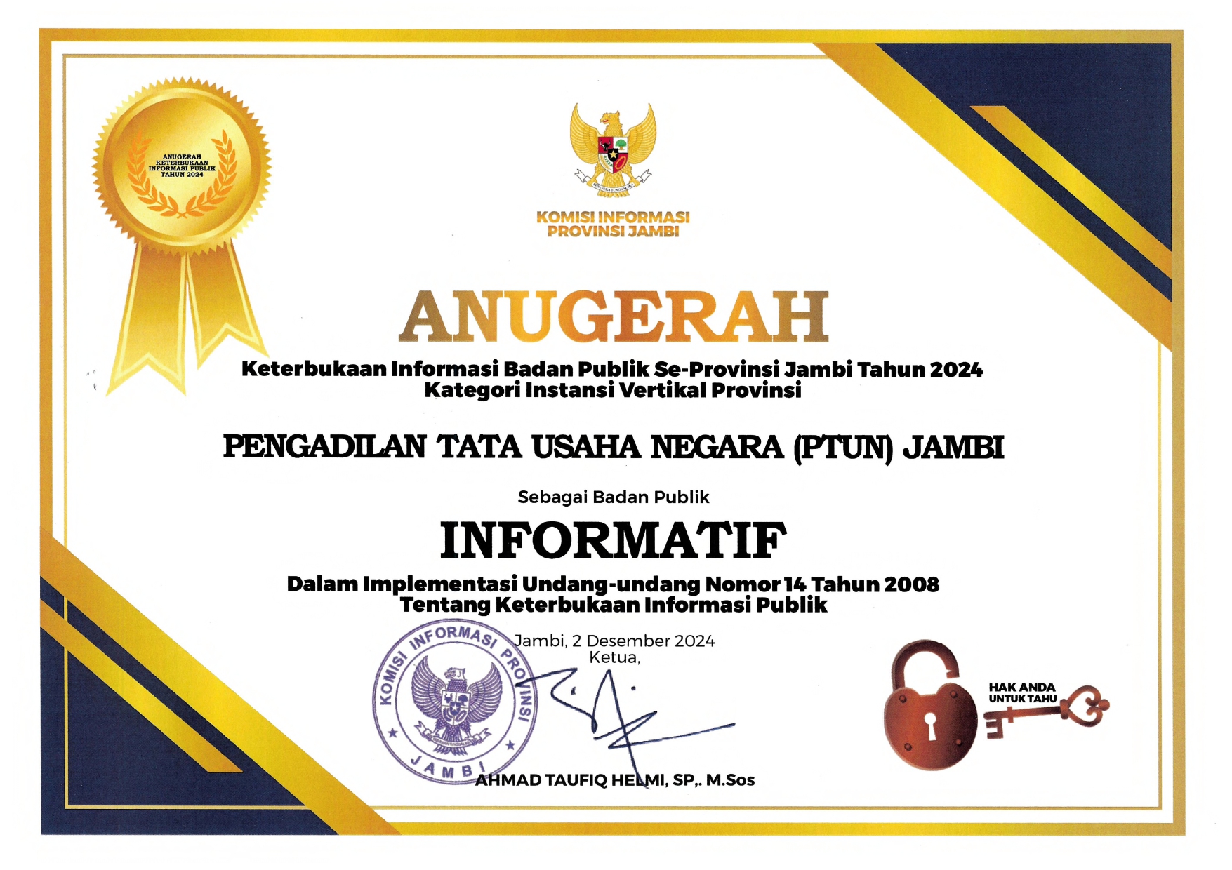 Dalam acara yang berlangsung di Ballroom Swiss-Belhotel Jambi itu Pengadilan Tata Usaha Negara Jambi menerima penghargaan sebagai Badan Publik INFORMATIF Dalam Implementasi Undang-Undang Nomor 14 Tahun 2008 Tentang Keterbukaan Informasi Publik.