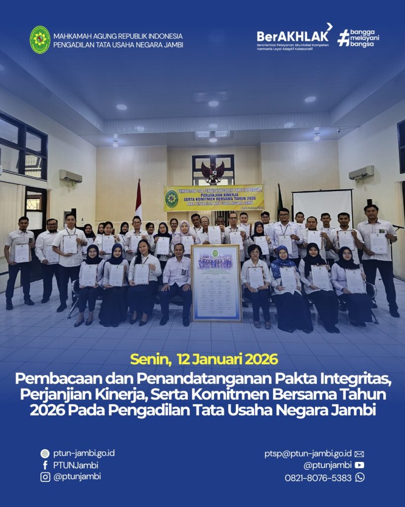 Senin, 12 Januari 2026 — Dalam rangka mengawali pelaksanaan tugas dan program kerja Tahun 2026, Pengadilan Tata Usaha Negara (PTUN) Jambi menyelenggarakan kegiatan Pembacaan dan Penandatanganan Pakta Integritas, Perjanjian Kinerja, serta Komitmen Bersama Tahun 2026. Kegiatan ini diikuti oleh seluruh unsur aparatur sipil negara di lingkungan PTUN Jambi. Pakta Integritas dibacakan dan ditandatangani sebagai pernyataan […]