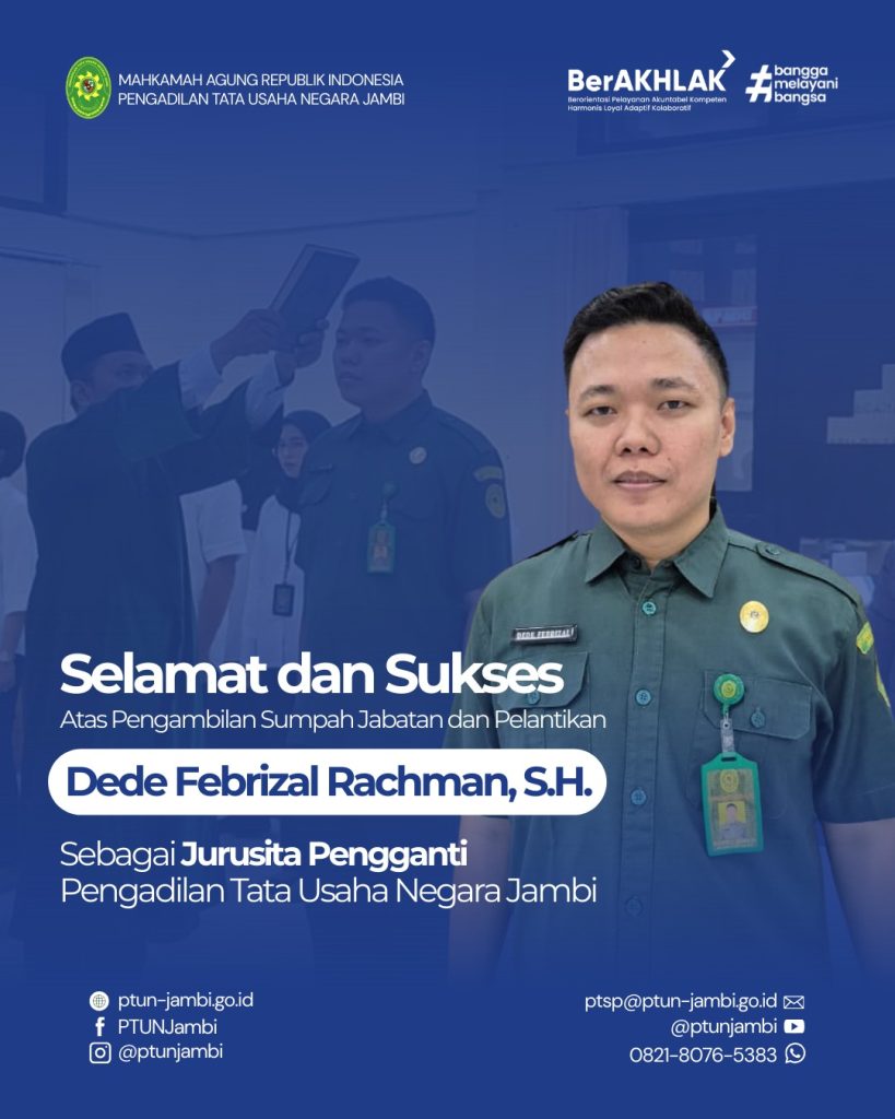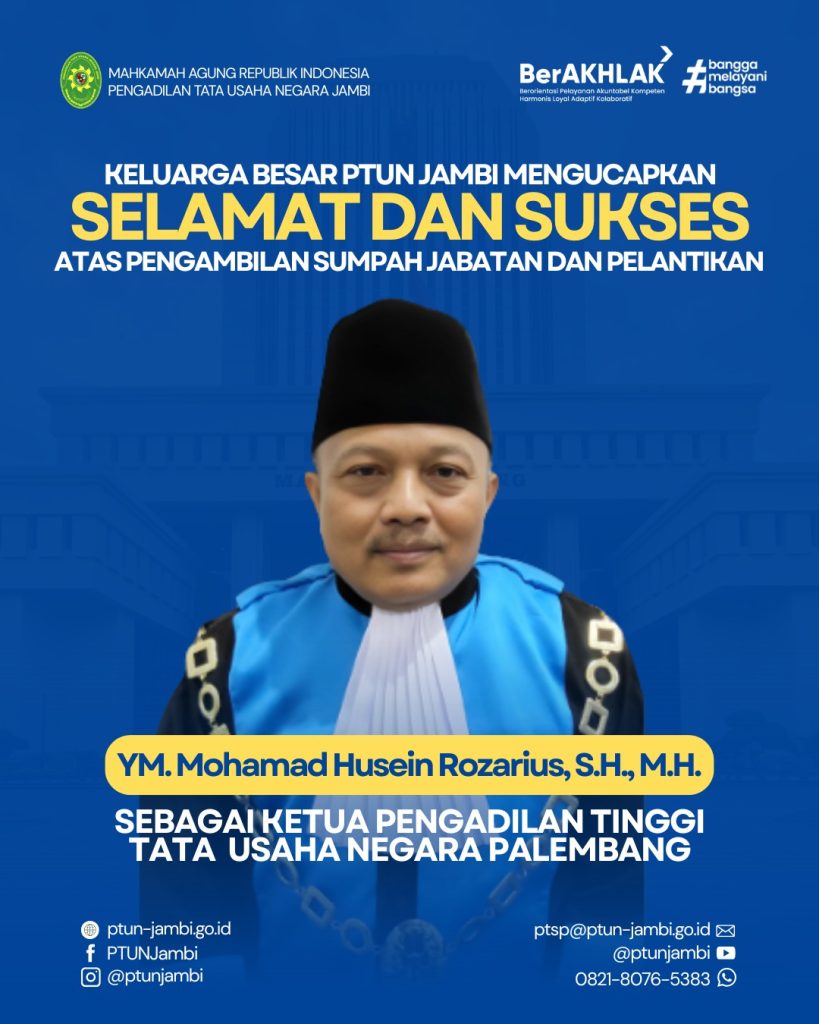 𝐊𝐞𝐥𝐮𝐚𝐫𝐠𝐚 𝐁𝐞𝐬𝐚𝐫 𝐏𝐞𝐧𝐠𝐚𝐝𝐢𝐥𝐚𝐧 𝐓𝐚𝐭𝐚 𝐔𝐬𝐚𝐡𝐚 𝐍𝐞𝐠𝐚𝐫𝐚 𝐉𝐚𝐦𝐛𝐢 Mengucapkan 𝐒𝐞𝐥𝐚𝐦𝐚𝐭 𝐝𝐚𝐧 𝐒𝐮𝐤𝐬𝐞𝐬 Atas alih tugas 𝐘𝐨𝐡𝐚𝐧𝐧𝐚 𝐏𝐞𝐭𝐫𝐞𝐬𝐢𝐚, 𝐒.𝐇. sebagai Hakim 𝗣𝗲𝗻𝗴𝗮𝗱𝗶𝗹𝗮𝗻 𝗧𝗮𝘁𝗮 𝗨𝘀𝗮𝗵𝗮 𝗡𝗲𝗴𝗮𝗿𝗮 𝗣𝗮𝗹𝗲𝗺𝗯𝗮𝗻𝗴 Terima kasih atas dedikasi, pengabdian, dan kebersamaan selama bertugas di Pengadilan Tata Usaha Negara Jambi. Semoga senantiasa diberikan kesehatan, kelancaran, serta amanah dalam mengemban tugas di tempat yang […]