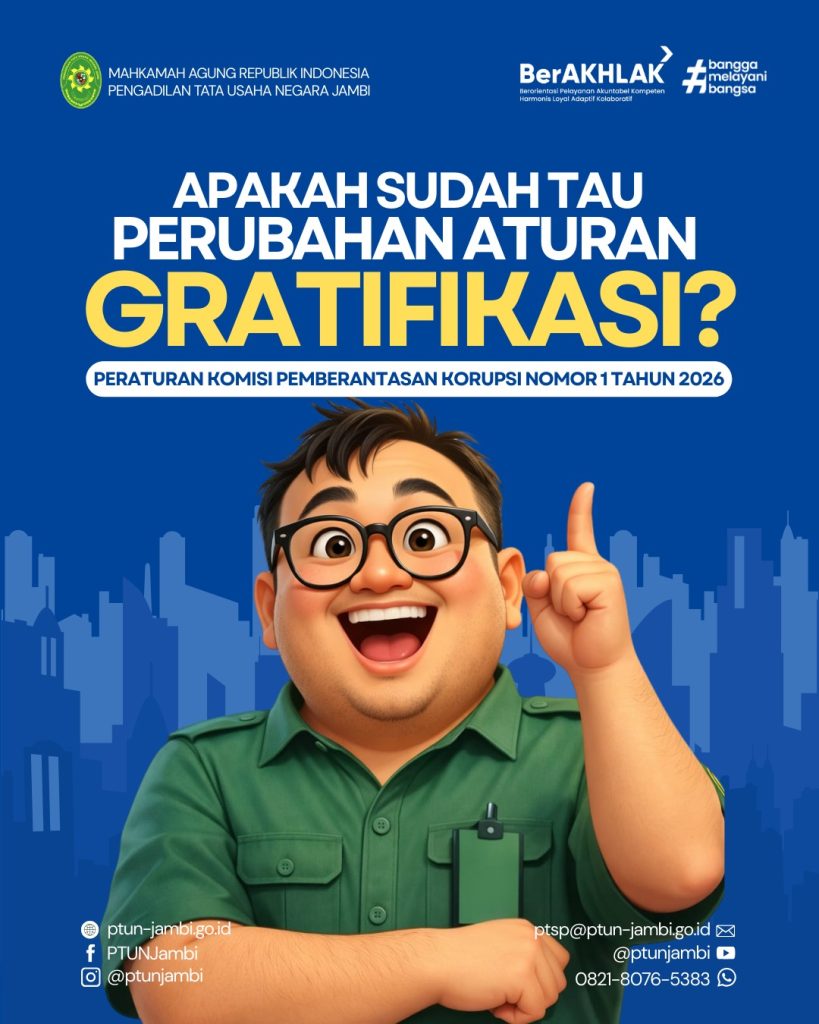 Pengadilan Tata Usaha Negara (PTUN) Jambi dengan ini menyampaikan informasi mengenai perubahan aturan gratifikasi yang perlu diketahui oleh seluruh Aparatur Sipil Negara (ASN) dan masyarakat. Gratifikasi merupakan pemberian dalam arti luas, baik berupa uang, barang, rabat (diskon), komisi, pinjaman tanpa bunga, tiket perjalanan, fasilitas penginapan, perjalanan wisata, pengobatan cuma-cuma, maupun fasilitas lainnya yang diterima oleh […]
