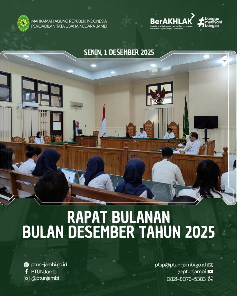 Pengadilan Tata Usaha Negara (PTUN) Jambi menyelenggarakan rapat rutin bulanan untuk periode Desember 2025 pada tanggal 1 Desember 2025 bertempat di Ruang Sidang Utama dan dipimpin langsung oleh Bapak Dr. Eko Yulianto, S.H., M.H., selaku Ketua PTUN Jambi serta didampingi oleh Ibu Oktova Primasari, S.H. selaku Wakil Ketua PTUN Jambi. Jalannya rapat dimoderatori oleh Ibu […]