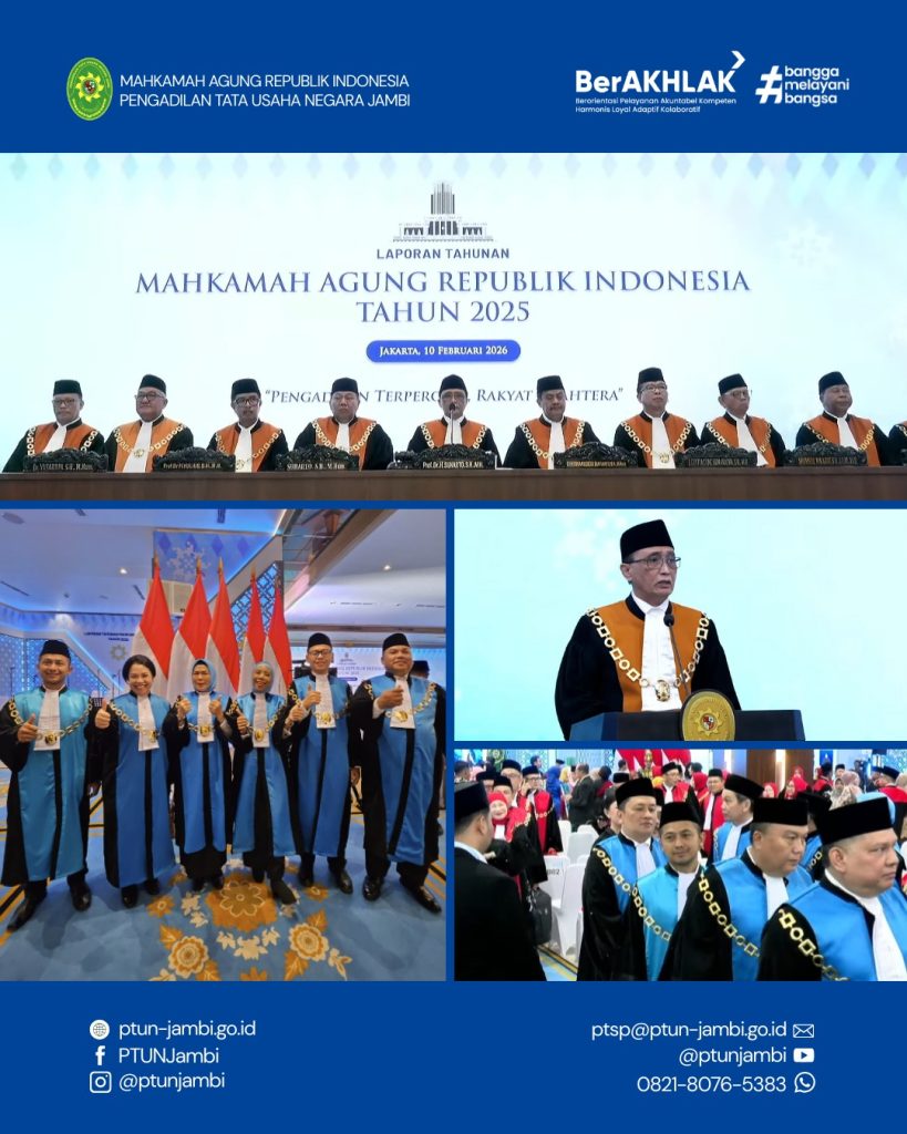 Selasa, 10 Februari 2026 — Mahkamah Agung Republik Indonesia menyelenggarakan Sidang Istimewa Laporan Tahunan Mahkamah Agung Republik Indonesia Tahun 2025 sebagai bentuk pertanggungjawaban kinerja lembaga peradilan kepada publik. Bapak Dr. Eko Yulianto, S.H., M.H., selaku Ketua Pengadilan Tata Usaha Negara (PTUN) Jambi, turut hadir dalam kegiatan tersebut sebagai bentuk dukungan terhadap komitmen Mahkamah Agung dalam […]