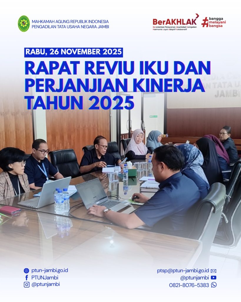 Pengadilan Tata Usaha Negara (PTUN) Jambi melaksanakan Rapat Reviu Indikator Kinerja Utama (IKU) dan Reviu Perjanjian Kinerja Tahun 2025 sebagai langkah strategis dalam memastikan keselarasan target kinerja dengan rencana pembangunan kelembagaan di tahun mendatang. Kegiatan ini bertujuan untuk mengevaluasi capaian, menyesuaikan indikator, serta merumuskan strategi yang lebih efektif dan terukur demi peningkatan kualitas penyelenggaraan peradilan. […]