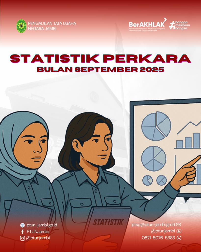 [INFORMASI: Statistik Perkara di PTUN Jambi] Pengadilan Tata Usaha Negara Jambi dengan ini menyampaikan informasi statistik perkara serta layanan lainnya pada periode bulan September 2025. Pada periode ini, jumlah perkara yang masih berjalan sebanyak 8 perkara. Dari jumlah tersebut, 1 Perkara masuk, 3 perkara telah diputus dan 6 perkara masih dalam proses persidangan. Selain penyelesaian […]