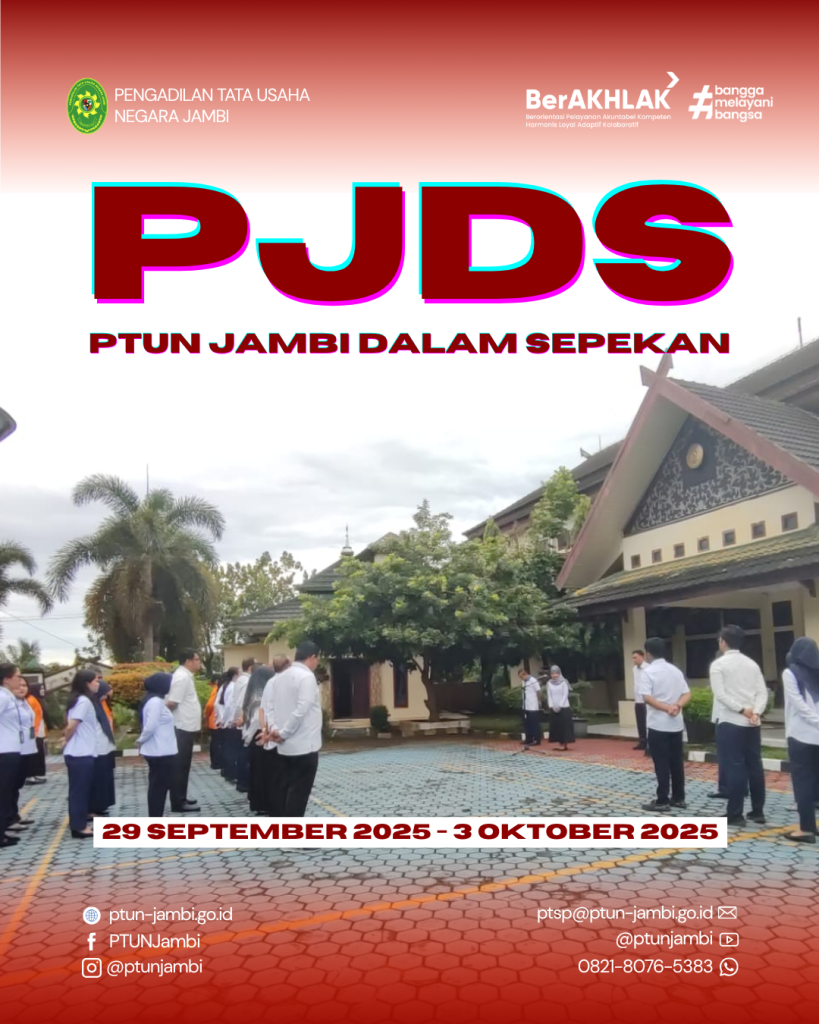 [PJDS: PTUN Jambi Dalam Sepekan] Sepanjang pekan 29 September–3 Oktober 2025, Pengadilan Tata Usaha Negara (PTUN) Jambi melaksanakan beragam kegiatan yang mencerminkan komitmen terhadap disiplin, kolaborasi, dan peningkatan kualitas kinerja aparatur. Hari Senin diawali dengan apel pagi yang dipimpin oleh Ibu Sekar Annisa, S.H., berlanjut dengan Diskusi Hakim Perempuan bersama narasumber dari Federal Court of […]