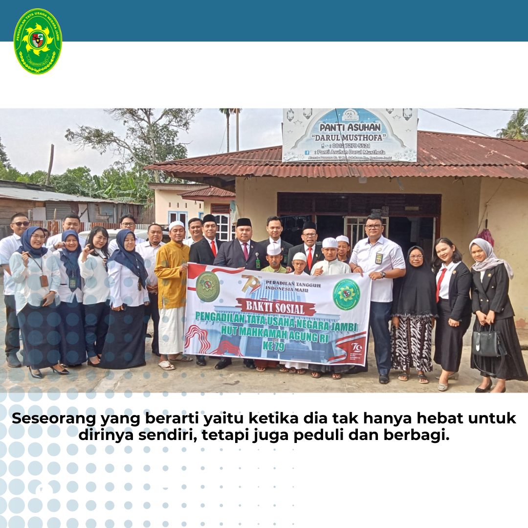 Jambi, ptun-jambi.go.id – Sebagai bentuk kepedulian dan rasa kasih sayang kepada anak-anak panti asuhan, Pengadilan Tata Usaha Negara Jambi melaksanakan bakti sosial di Panti Asuhan Darul Musthofa pada Senin, 19 Agustus 2024 yang lalu.
