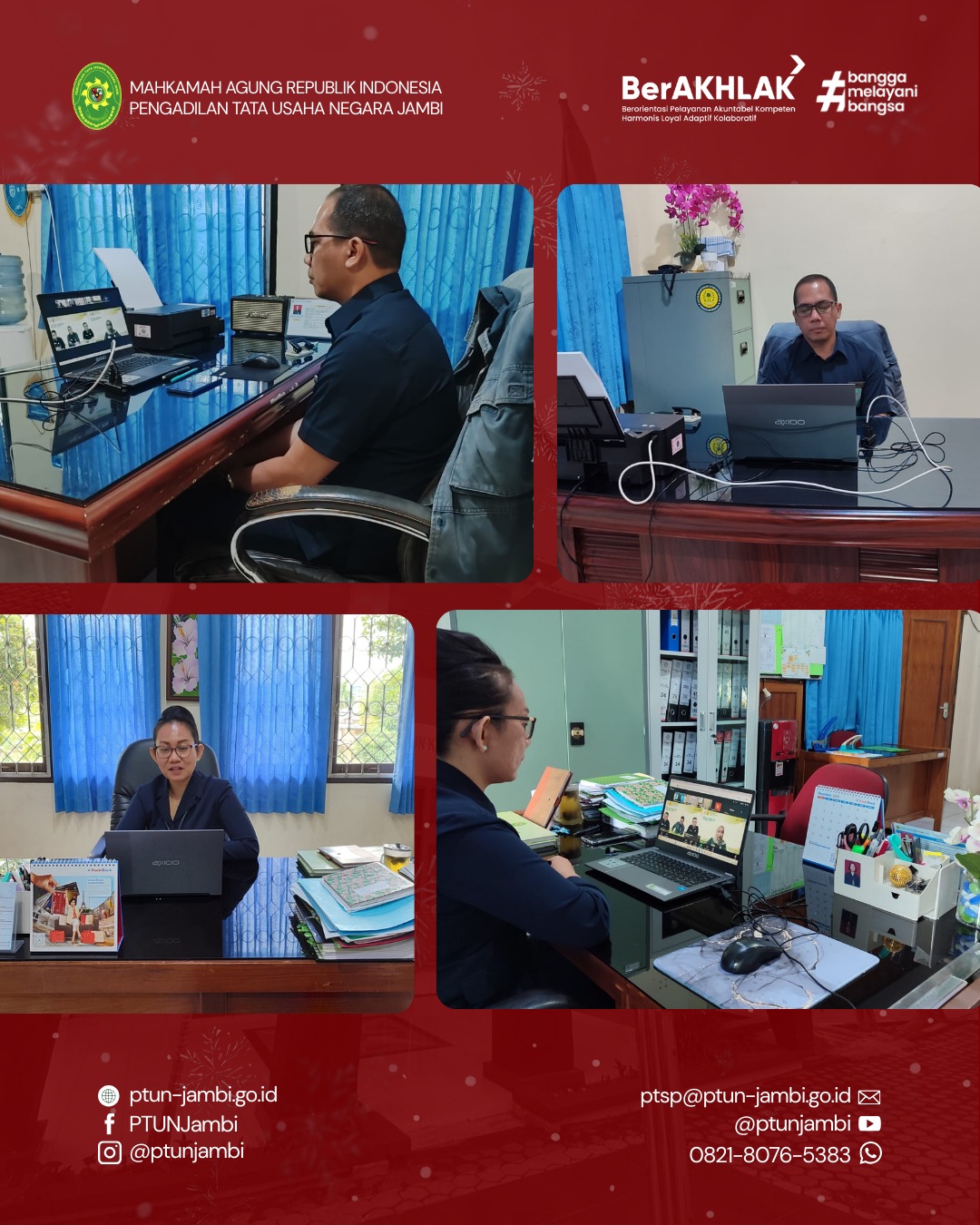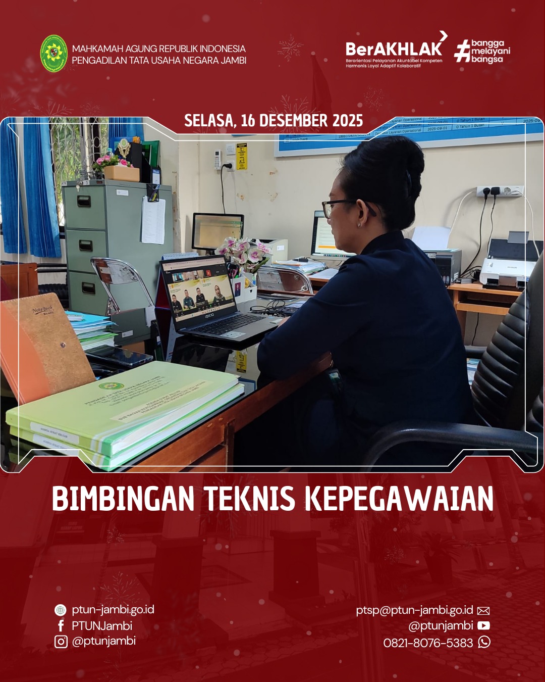 Selasa, 16 Desember 2025 — Sekretaris dan Kepala Sub Bagian Kepegawaian, Organisasi, dan Tata Laksana Pengadilan Tata Usaha Negara (PTUN) Jambi mengikuti kegiatan Bimbingan Teknis Kepegawaian secara daring. Kegiatan ini dilaksanakan dalam rangka meningkatkan kompetensi para pengelola kepegawaian di lingkungan Mahkamah Agung dan badan peradilan yang berada di bawahnya.