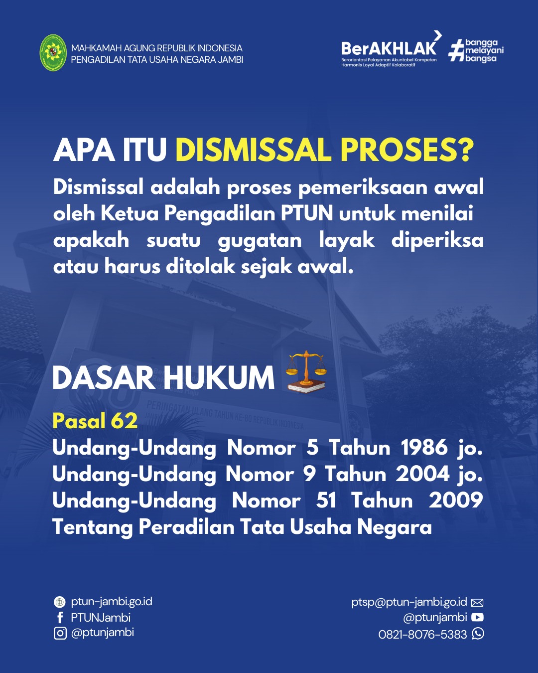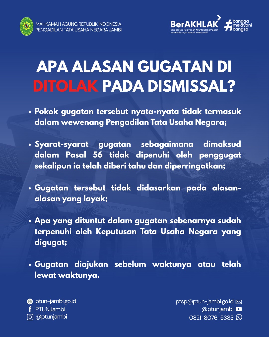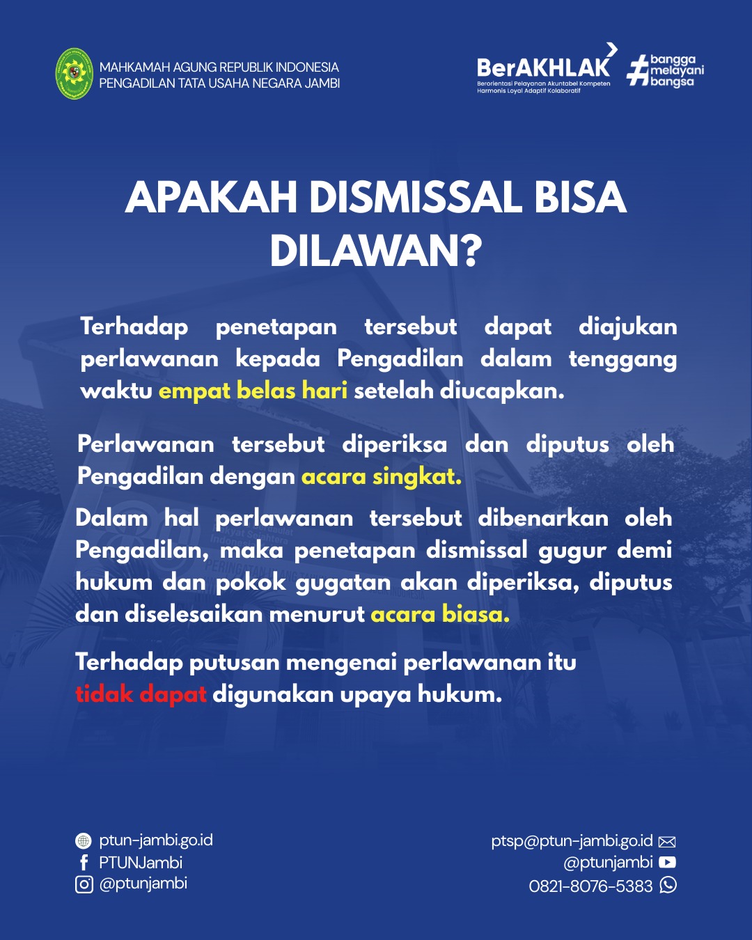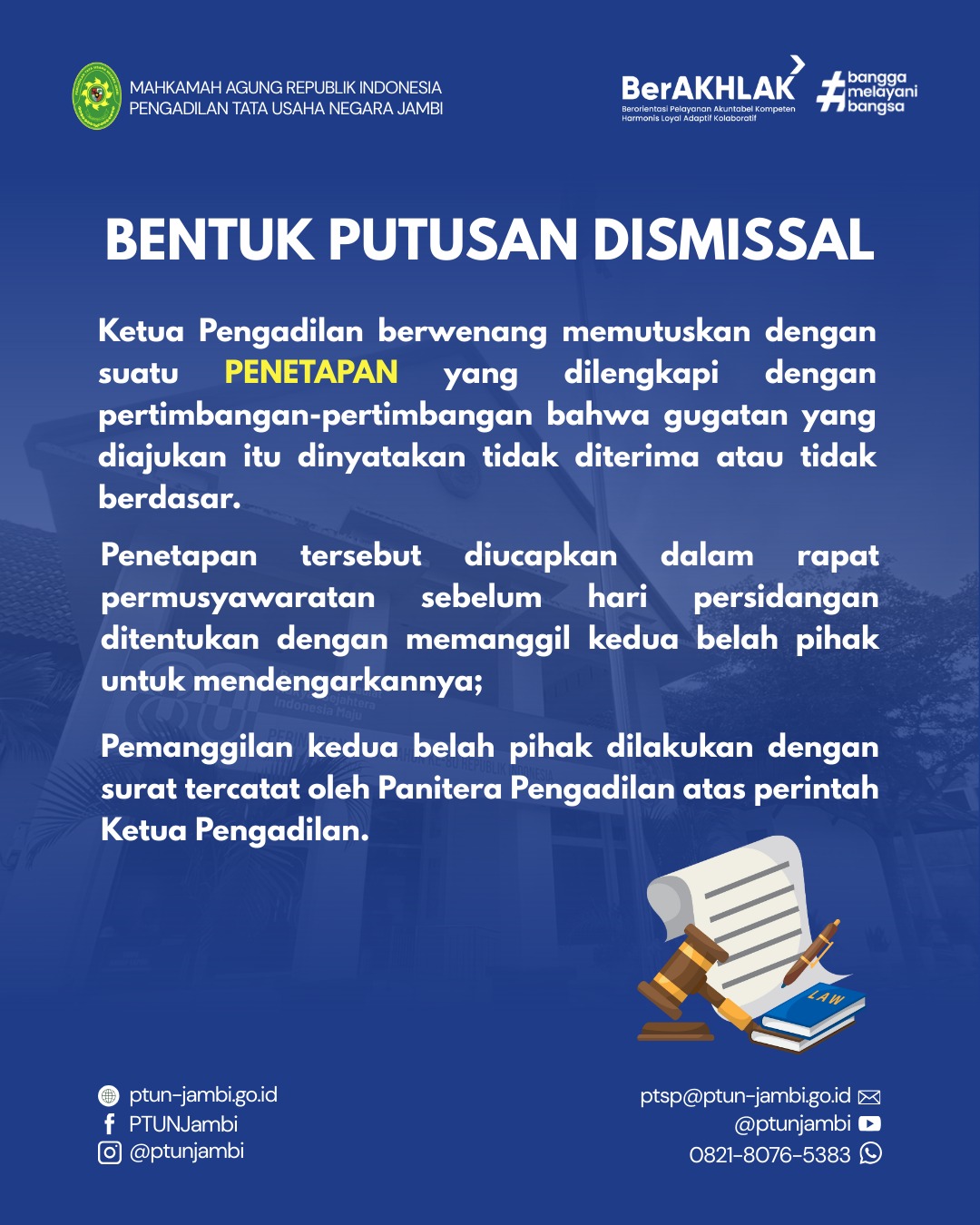 Adapun informasi secara lengkap terkait pengertian, dasar hukum, alasan gugatan ditolak pada dismissal, bentuk putusan dismissal, serta penjelasan apakah dismissal bisa dilawan dapat dilihat pada gambar terlampir. PTUN Jambi akan terus berkomitmen untuk memberikan informasi yang informatif, transparan, dan akuntabel kepada masyarakat.