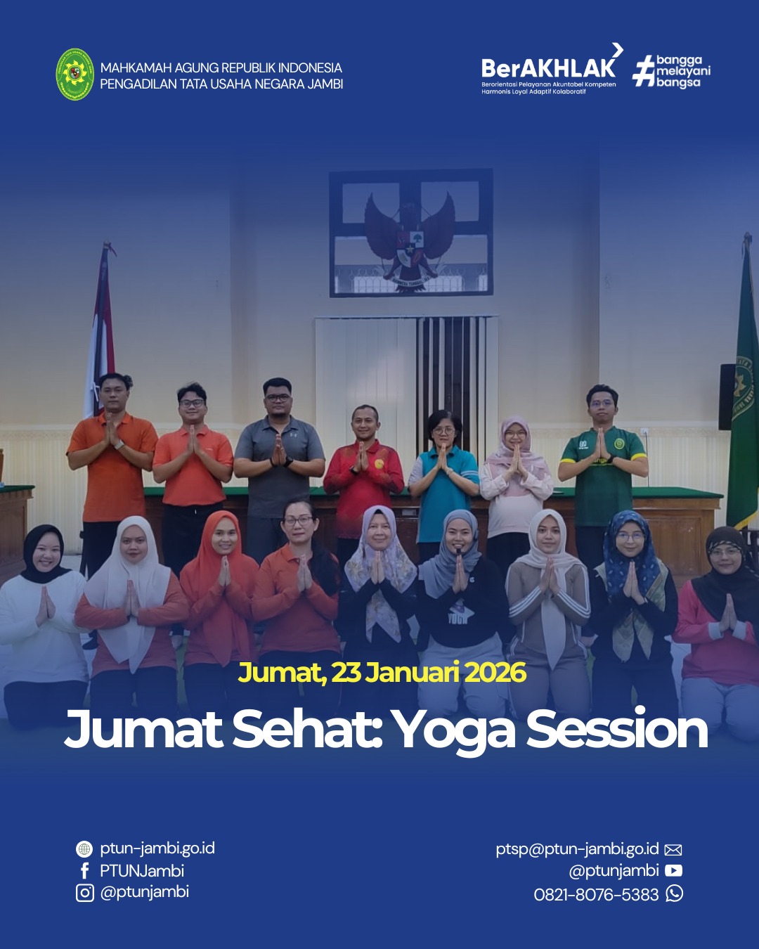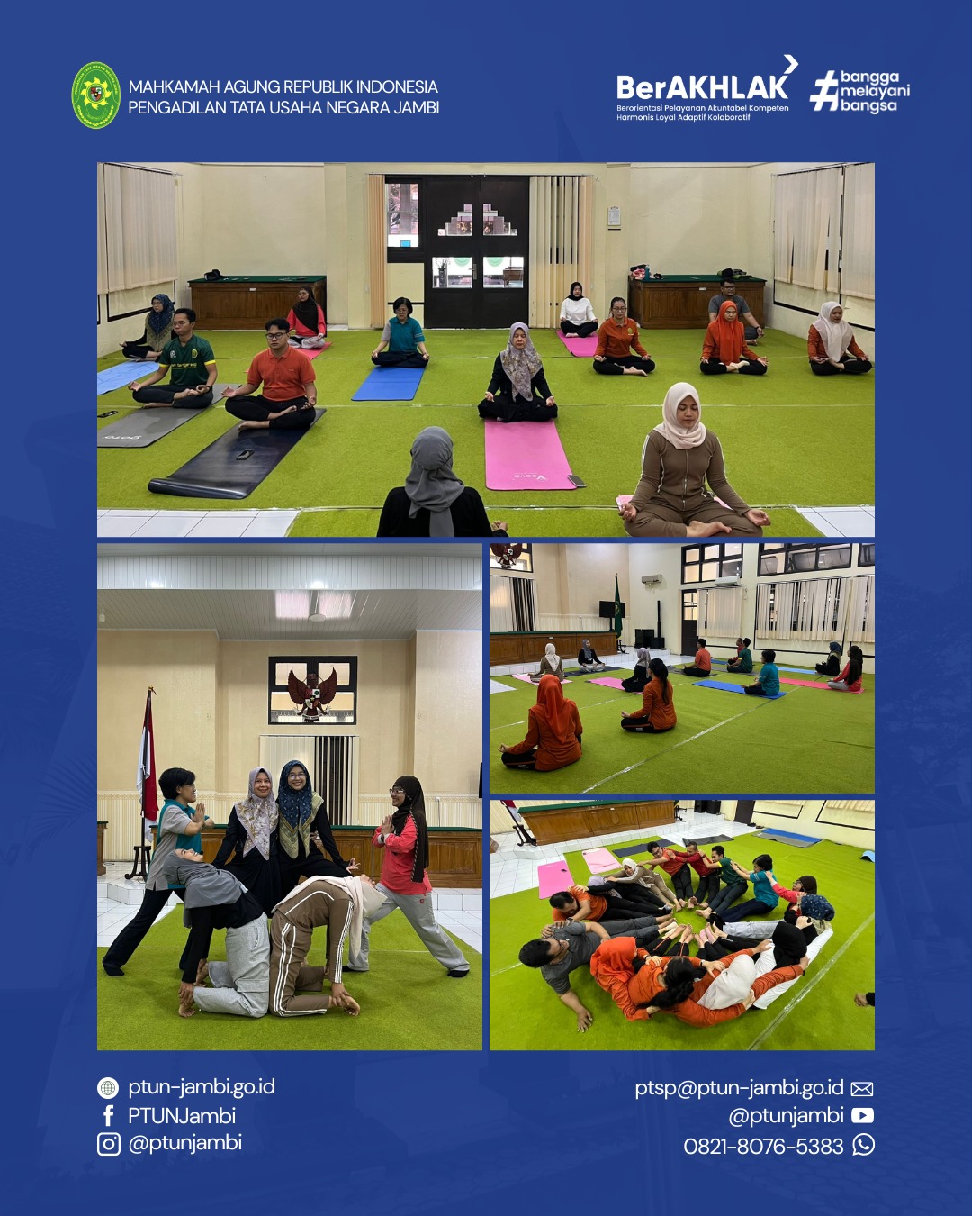 Jumat, 23 Januari 2026 — Pengadilan Tata Usaha Negara (PTUN) Jambi kembali melaksanakan kegiatan Jumat Sehat dengan agenda Yoga bersama yang dilaksanakan di lingkungan kantor dengan mengundang instruktur yoga sebagai pendamping kegiatan.