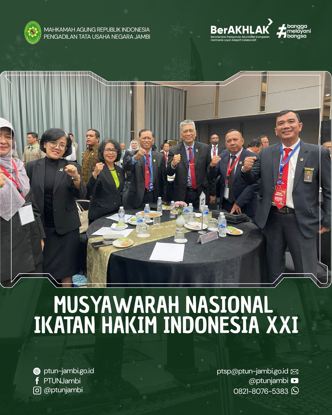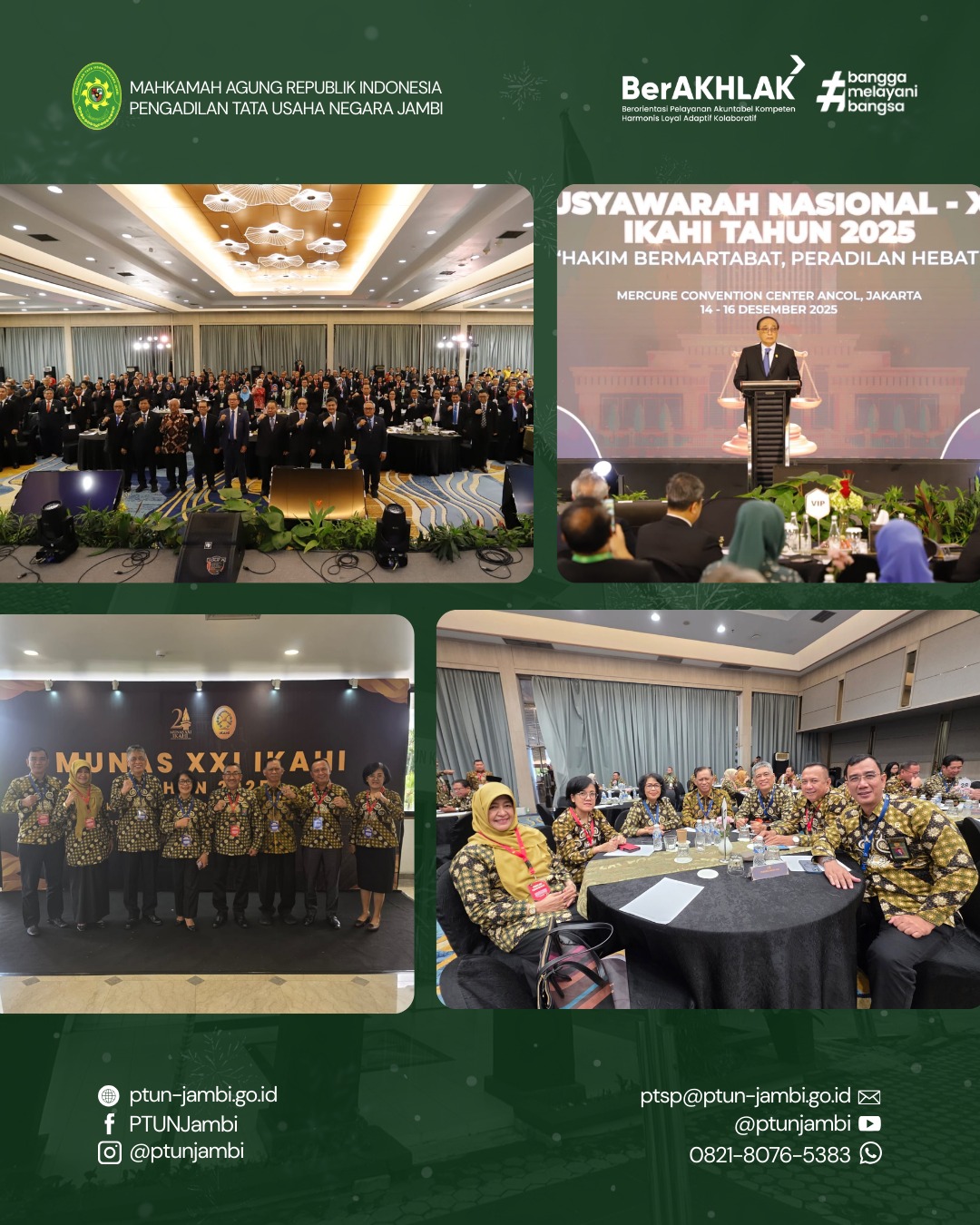 MUNAS IKAHI XXI diikuti oleh para hakim dari seluruh Indonesia, baik yang hadir secara langsung maupun daring. Dalam kegiatan ini, Pengadilan Tata Usaha Negara Jambi diwakili oleh Ibu Oktova Primasari, S.H., selaku Wakil Ketua Pengadilan Tata Usaha Negara Jambi, sebagai bentuk partisipasi aktif dalam forum organisasi profesi hakim.
