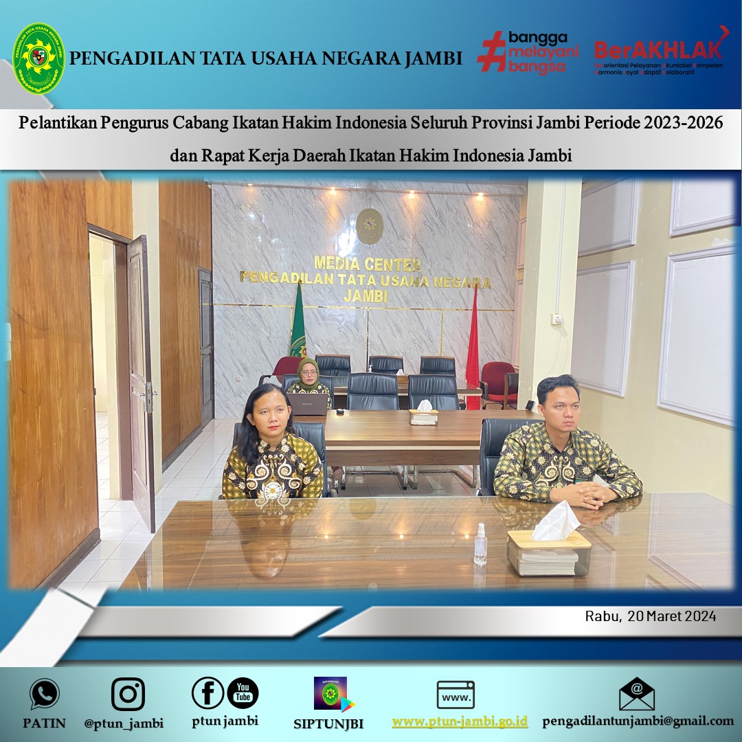Ketua Pengadilan Tata Usaha Negara Jambi menghadiri Pelantikan Pengurus Cabang Ikatan Hakim Indonesia Seluruh Provinsi Jambi Periode 2023-2026 dan Rapat Kerja Daerah Ikatan Hakim Indonesia Provinsi Jambi di Pengadilan Tinggi Jambi. Beserta Para Hakim Pengadilan Tata Usaha Negara Jambi yang Menghadiri secara Daring di ruang Media Center Pengadilan Tata Usaha Negara Jambi.