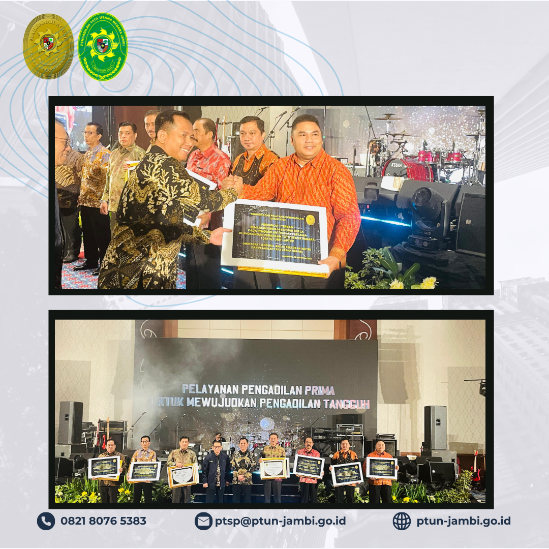 Pengadilan Tata Usaha Negara Jambi Memperoleh Juara 1 Kategori Penilaian Kinerja Satuan Kerja Pengadilan Tingkat Pertama Berdasarkan Indikator Kinerja Utama yang diselenggarakan oleh Direktorat Jenderal Badan Peradilan Militer dan Peradilan Tata Usaha Negara Mahkamah Agung RI dalam rangkaian Kegiatan Lomba Peningkatan Pelayanan Peradilan Tahun 2024.