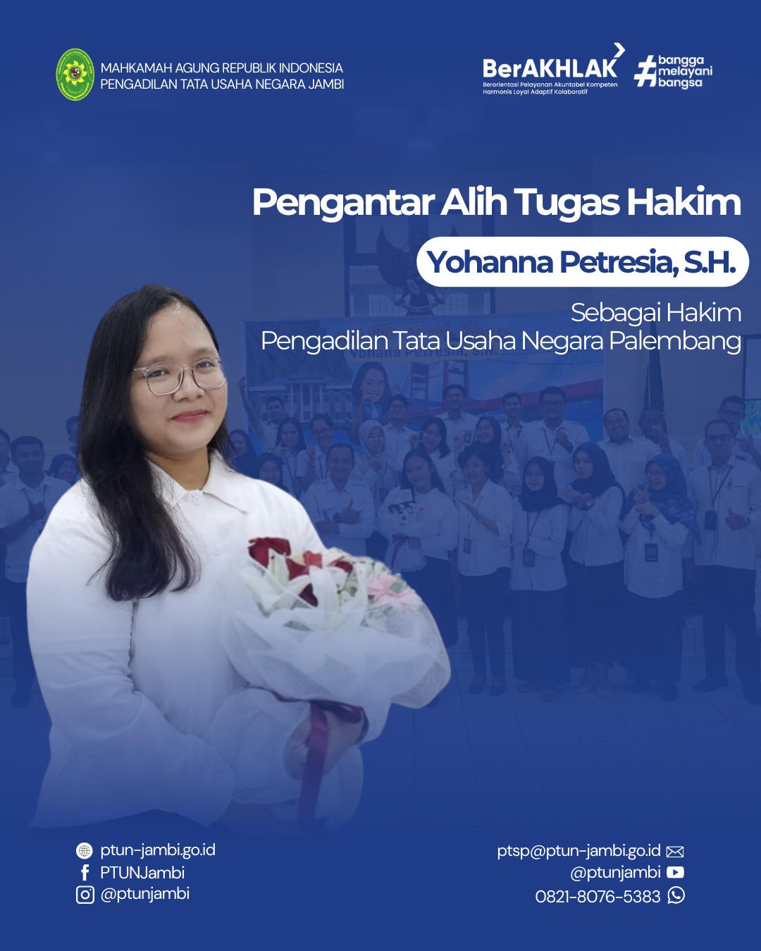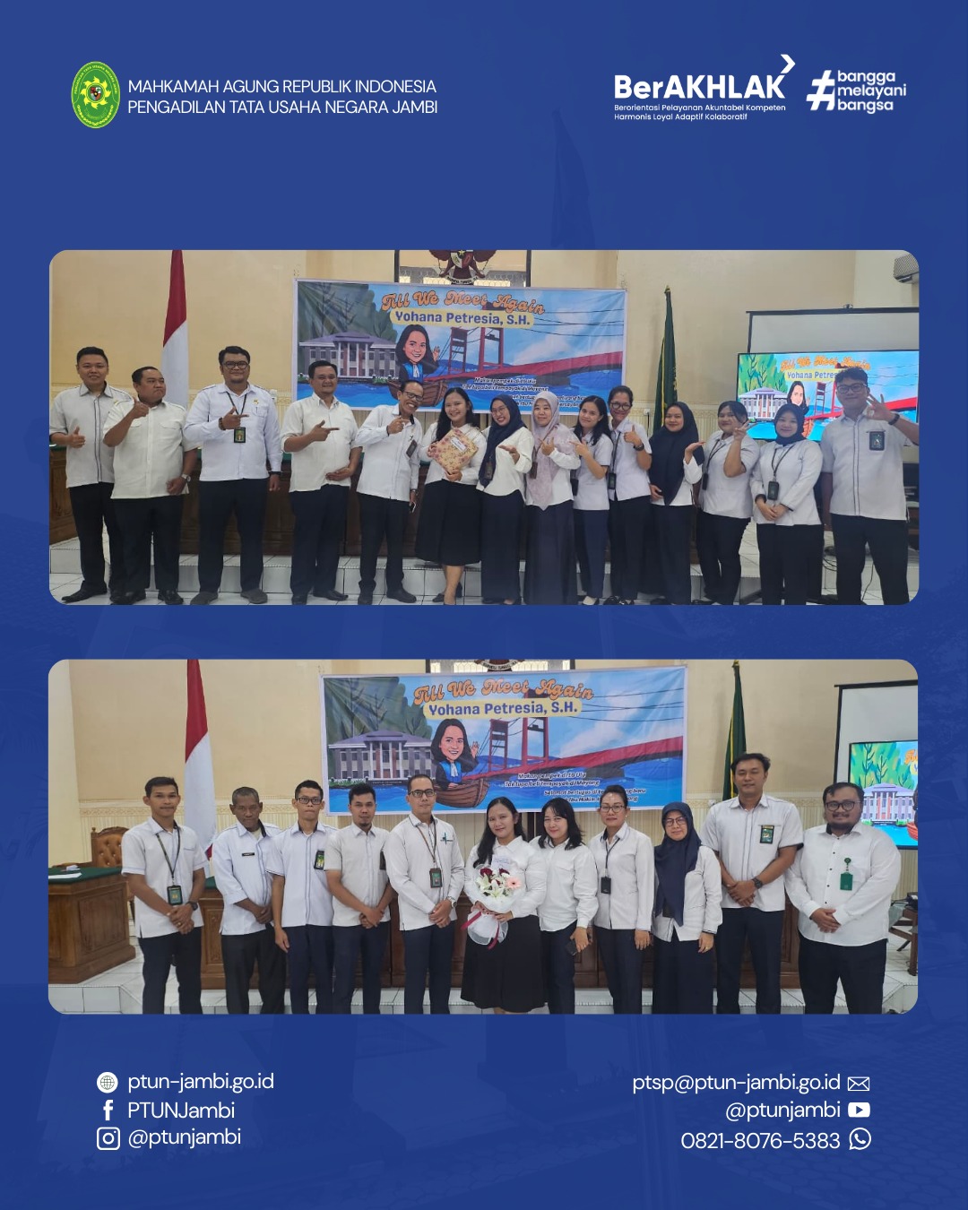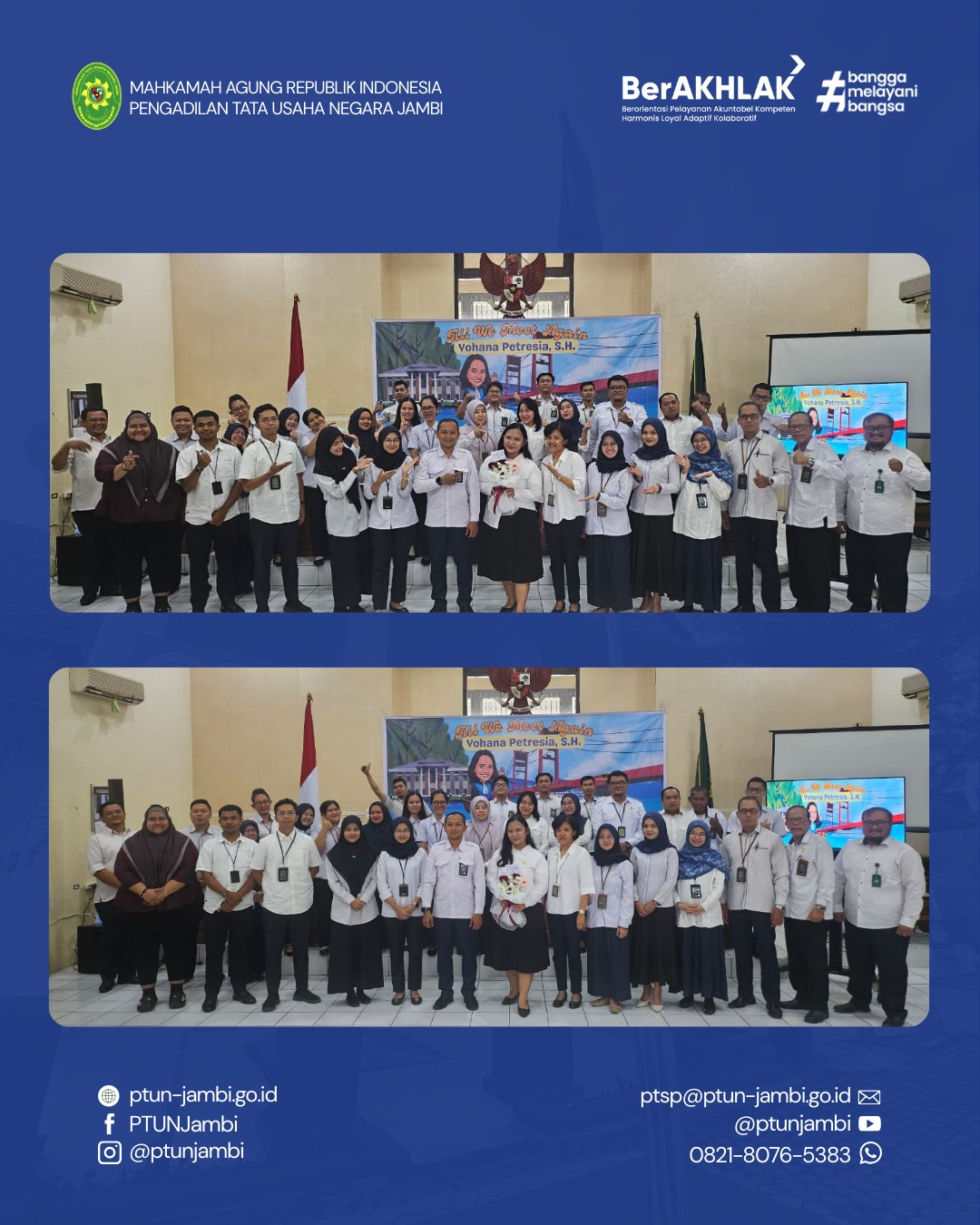 Terima kasih atas dedikasi, pengabdian, dan kebersamaan selama bertugas di Pengadilan Tata Usaha Negara Jambi. Semoga senantiasa diberikan kesehatan, kelancaran, serta amanah dalam mengemban tugas di tempat yang baru, dan terus menegakkan keadilan dengan penuh integritas dan profesionalisme.