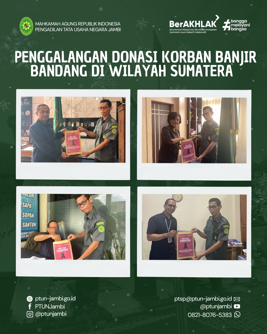 Pengadilan Tata Usaha Negara Jambi melaksanakan penggalangan donasi bagi korban banjir bandang yang melanda wilayah Aceh, Sumatera Utara, dan Sumatera Barat. Kegiatan ini merupakan bagian dari dukungan PTUN Jambi terhadap program Mahkamah Agung Peduli serta Sumatera Peduli yang digagas oleh Direktorat Jenderal Badan Peradilan Militer dan Peradilan Tata Usaha Negara.