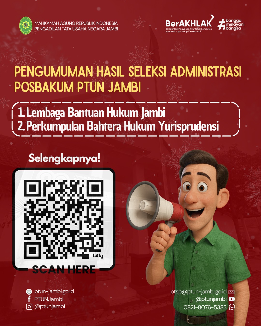 Sebagai tindaklanjut, kedua lembaga tersebut diwajibkan untuk mengikuti tahapan seleksi berikutnya berupa tes tertulis dan wawancara yang akan dilaksanakan pada Rabu, 17 Desember 2025 Pukul 09.00 WIB di Pengadilan Tata Usaha Negara Jambi. 𝗨𝗻𝘁𝘂𝗸 𝗶𝗻𝗳𝗼𝗿𝗺𝗮𝘀𝗶 𝗹𝗲𝗯𝗶𝗵 𝗹𝗮𝗻𝗷𝘂𝘁, 𝘀𝗶𝗹𝗮𝗸𝗮𝗻 𝗺𝗲𝗺𝗶𝗻𝗱𝗮𝗶 𝗯𝗮𝗿𝗰𝗼𝗱𝗲 𝘆𝗮𝗻𝗴 𝘁𝗲𝗿𝘀𝗲𝗱𝗶𝗮 𝗽𝗮𝗱𝗮 𝗽𝗼𝘀𝘁𝗲𝗿.