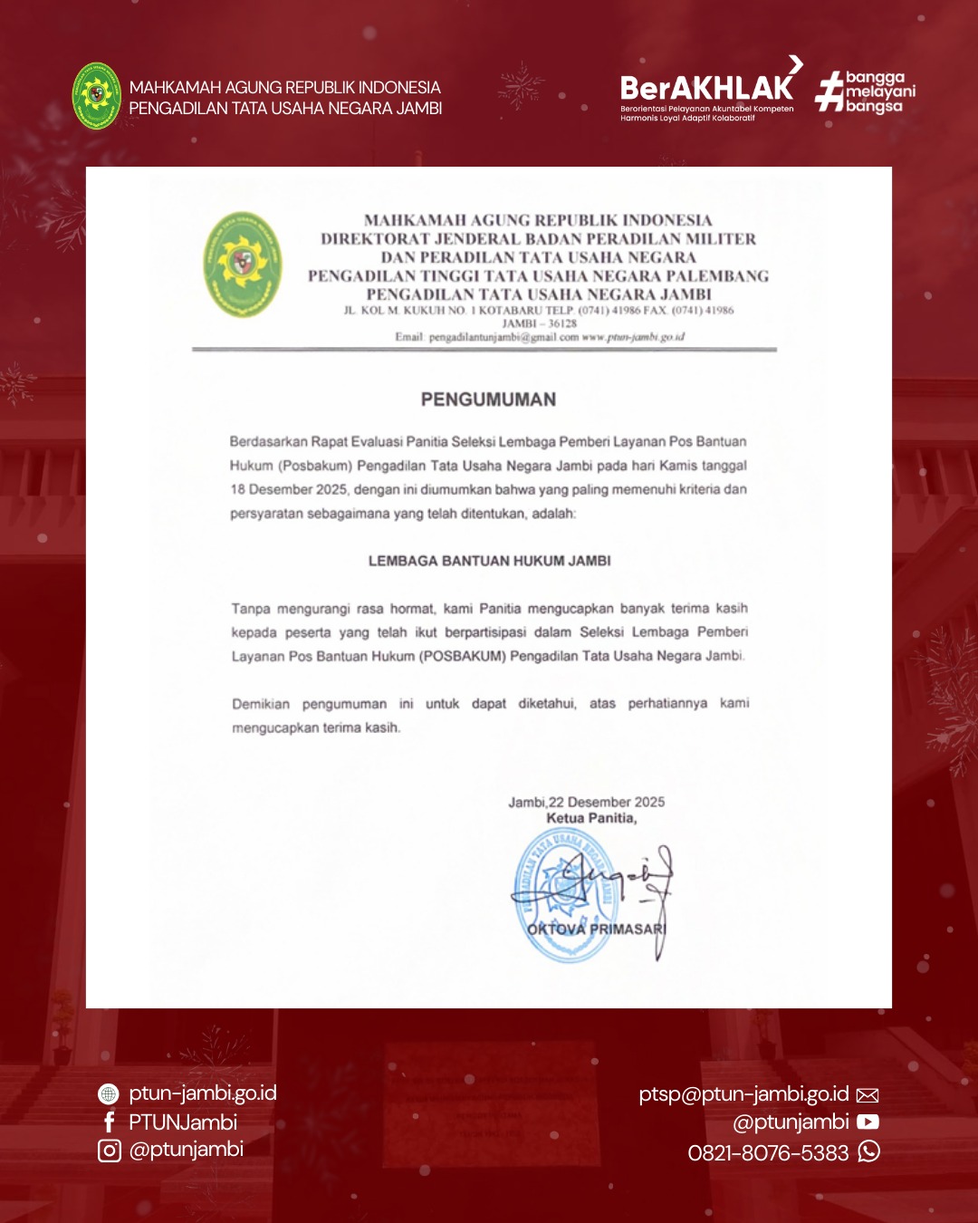 Panitia Seleksi Posbakum Pengadilan Tata Usaha Negara (PTUN) Jambi telah menyelesaikan seluruh rangkaian seleksi dan melaksanakan rapat evaluasi seleksi pada Kamis, 18 Desember 2025. Berdasarkan hasil penilaian yang dilakukan secara objektif dan menyeluruh sesuai dengan ketentuan yang berlaku, Panitia Seleksi menetapkan bahwa lembaga yang dinyatakan paling memenuhi kriteria sebagai Lembaga Pemberi Layanan Pos Bantuan Hukum (Posbakum) pada PTUN Jambi Tahun Anggaran 2026 adalah: