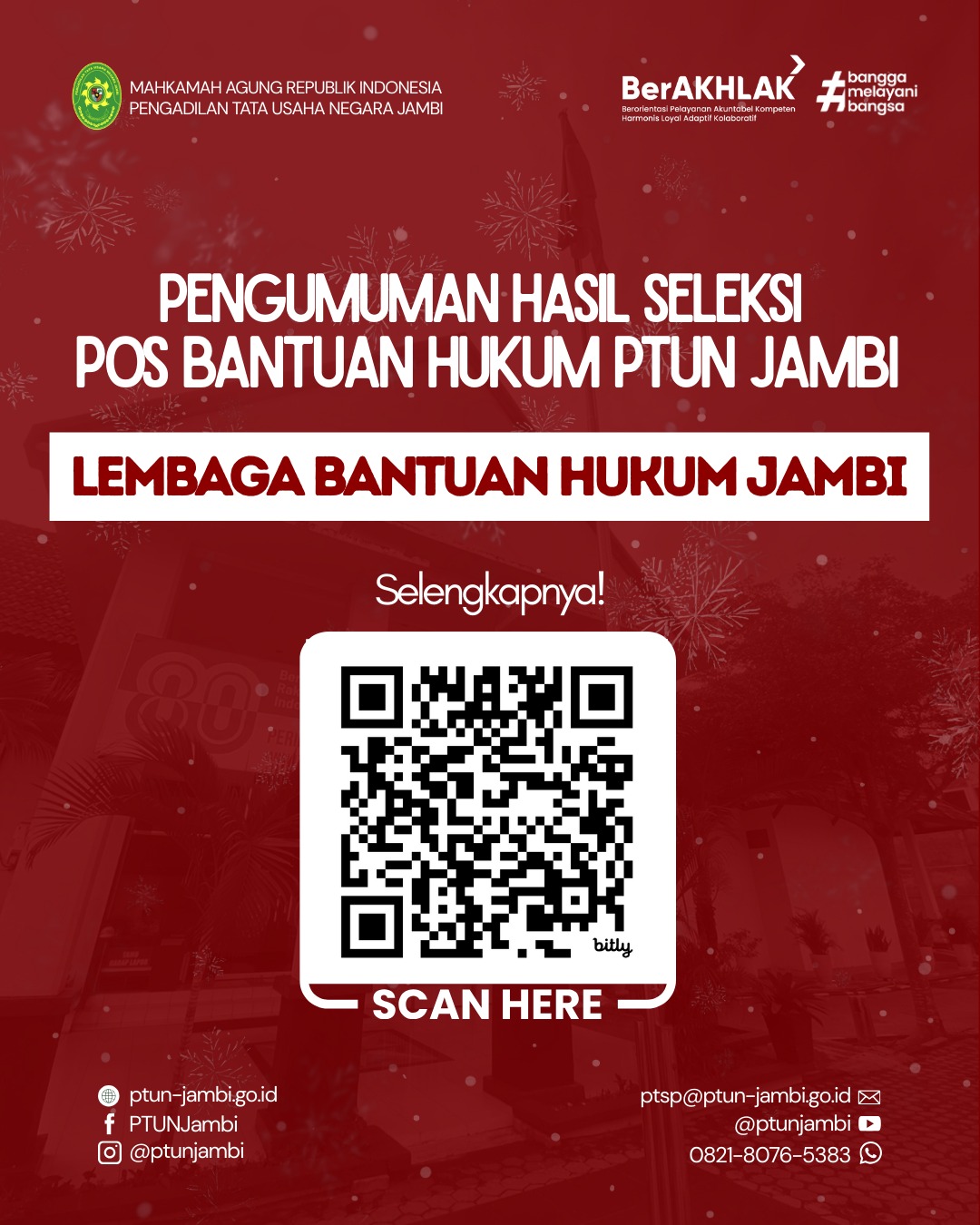 PTUN Jambi menyampaikan ucapan selamat kepada Lembaga Bantuan Hukum Jambi. Diharapkan kerja sama ini dapat berjalan dengan baik serta mampu memberikan pelayanan bantuan hukum yang optimal, profesional, dan berintegritas bagi masyarakat pencari keadilan. Panitia Seleksi turut menyampaikan apresiasi dan terima kasih kepada seluruh lembaga yang telah berpartisipasi dalam proses seleksi ini atas perhatian, partisipasi, dan kerja sama yang diberikan. Demikian pengumuman ini disampaikan untuk diketahui. Untuk pengumuman selengkapnya, silakan memindai barcode yang tersedia pada poster. Atas perhatian dan kerja sama seluruh pihak, kami ucapkan terima kasih.