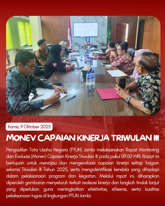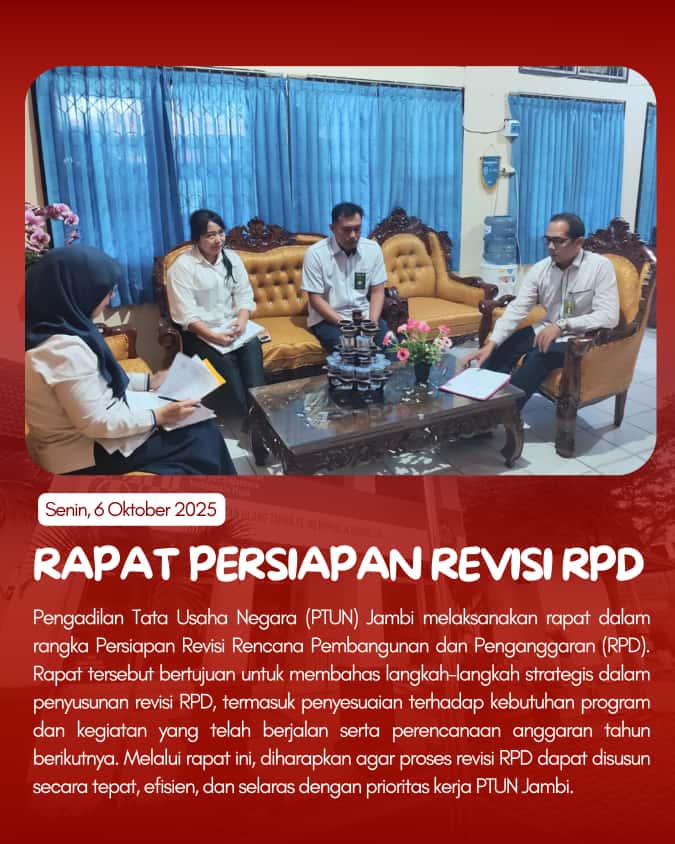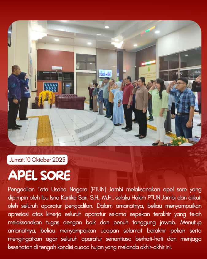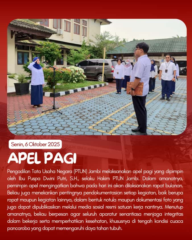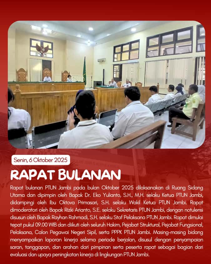 Sepanjang pekan 6–10 Oktober 2025, Pengadilan Tata Usaha Negara (PTUN) Jambi melaksanakan berbagai agenda yang mencerminkan komitmen terhadap profesionalitas, integritas, dan peningkatan kinerja aparatur.