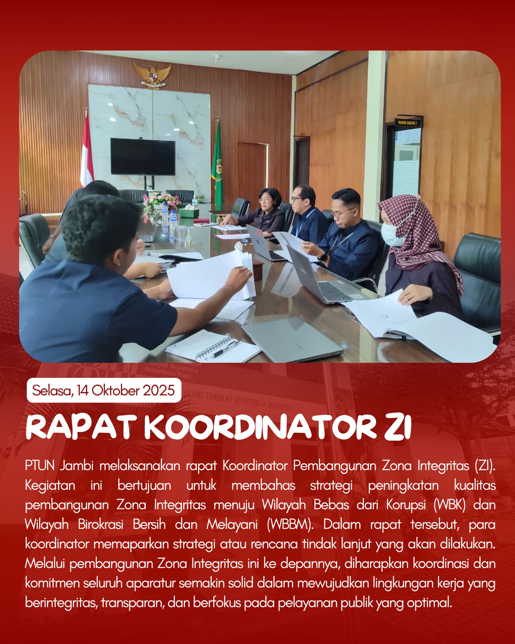 Pekan ini diawali dengan apel pagi yang dipimpin oleh Bapak Boghi Megananda, S.H., dilanjutkan pada hari Selasa dengan rapat Koordinator Pembangunan Zona Integritas (ZI) sebagai langkah memperkuat komitmen menuju WBK dan WBBM. Kemudian pada hari Rabu, Ibu Nyimas Olivia Rachmania, S.H. menjadi narasumber dalam rapat bersama Ombudsman RI Perwakilan Jambi.