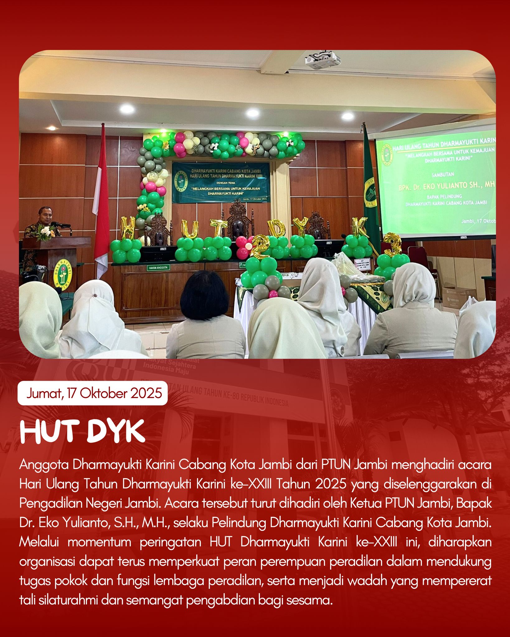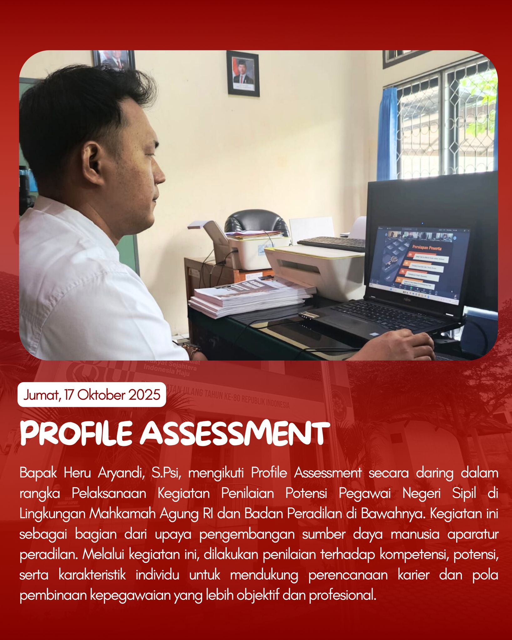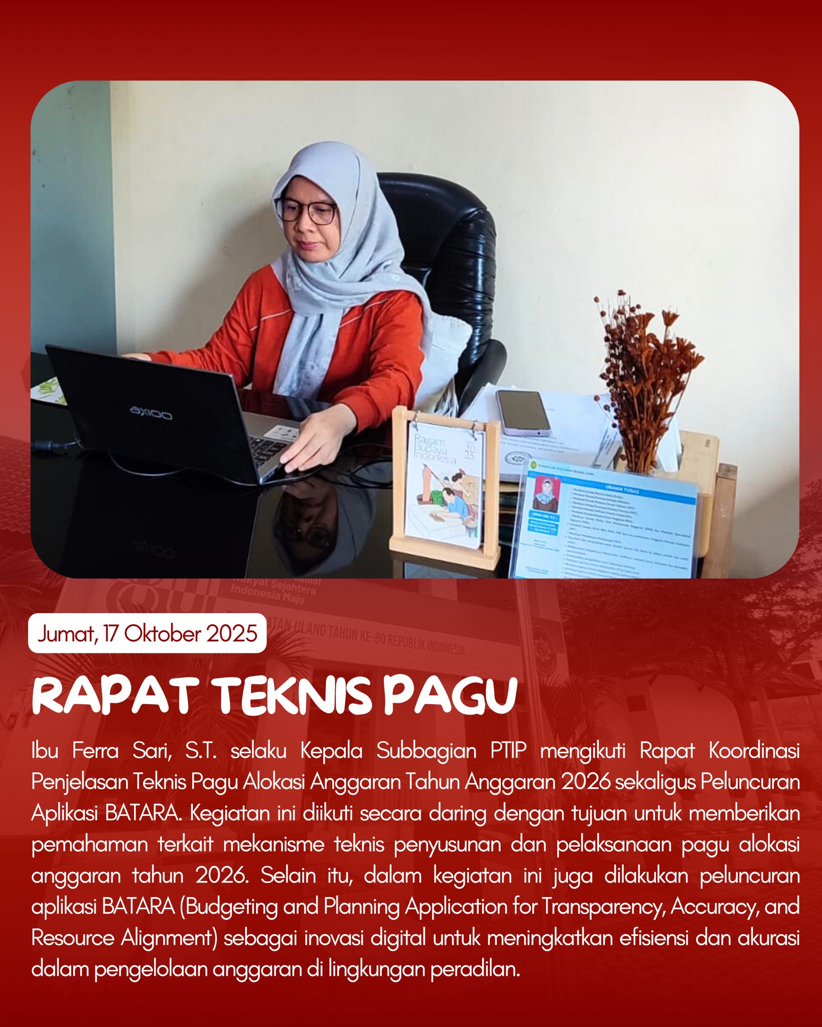 Pada hari Jumat, PTUN Jambi mengikuti berbagai kegiatan, mulai dari Jumat Bersih, Seminar Nasional YSEALI, hingga peringatan HUT Dharmayukti Karini ke-XXIII. Selain itu, juga dilaksanakan Rapat Koordinasi Teknis Alokasi Anggaran TA 2026 dan peluncuran aplikasi BATARA, serta asesmen pegawai dalam rangka pengembangan SDM aparatur.