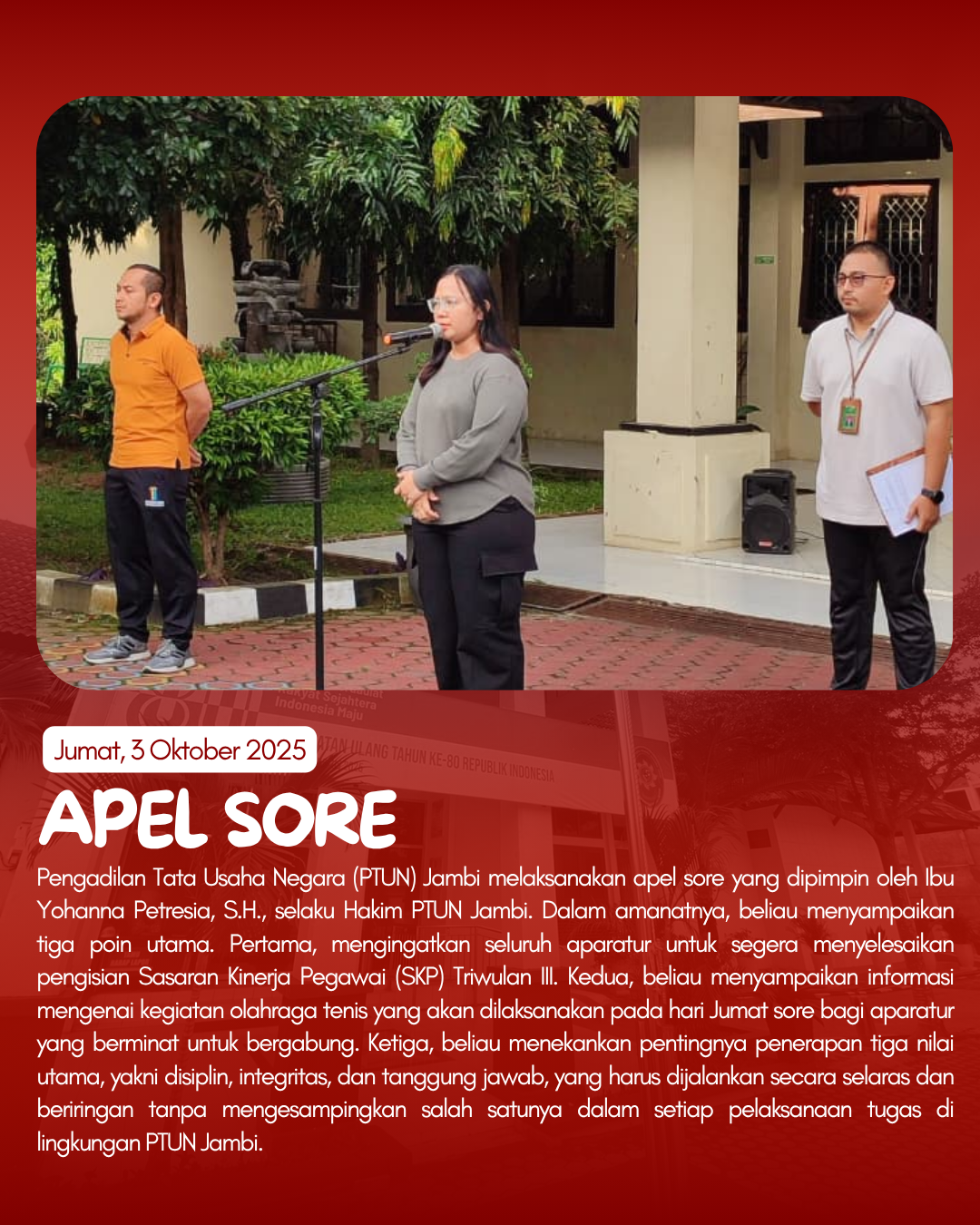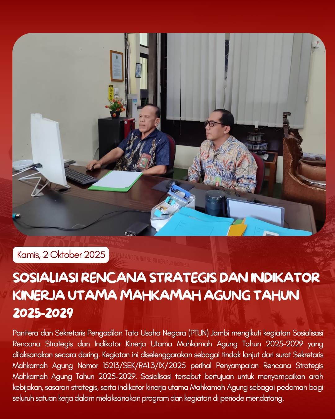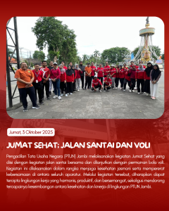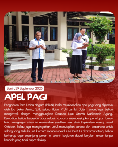 Sepanjang pekan 29 September–3 Oktober 2025, Pengadilan Tata Usaha Negara (PTUN) Jambi melaksanakan beragam kegiatan yang mencerminkan komitmen terhadap disiplin, kolaborasi, dan peningkatan kualitas kinerja aparatur.