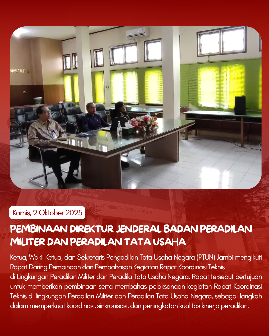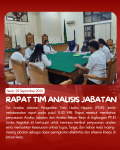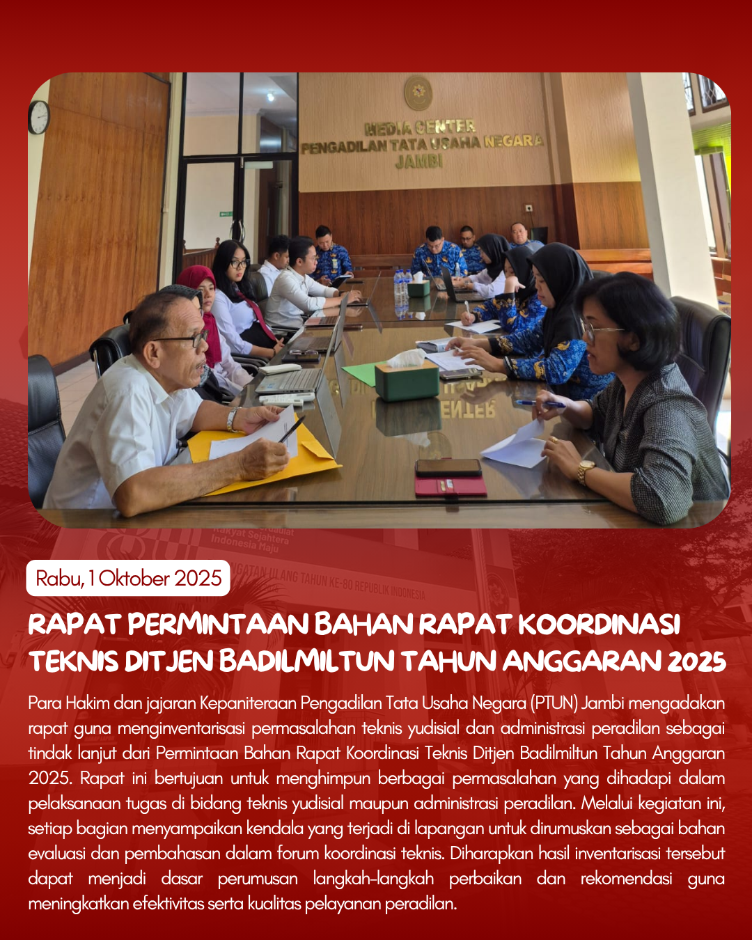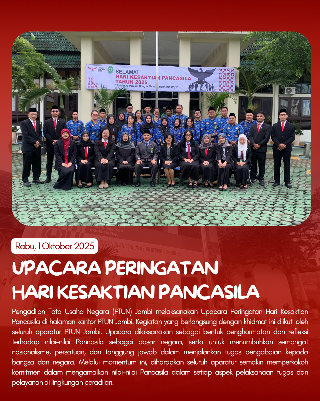 Memasuki Rabu, PTUN Jambi menggelar Upacara Hari Kesaktian Pancasila dan Rapat Koordinasi Teknis sebagai langkah inventarisasi permasalahan teknis yudisial dan administrasi peradilan.