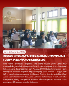 Hari Senin diawali dengan apel pagi yang dipimpin oleh Ibu Sekar Annisa, S.H., berlanjut dengan Diskusi Hakim Perempuan bersama narasumber dari Federal Court of Australia, serta rapat tim Anjab untuk menyusun analisa jabatan dan beban kerja.