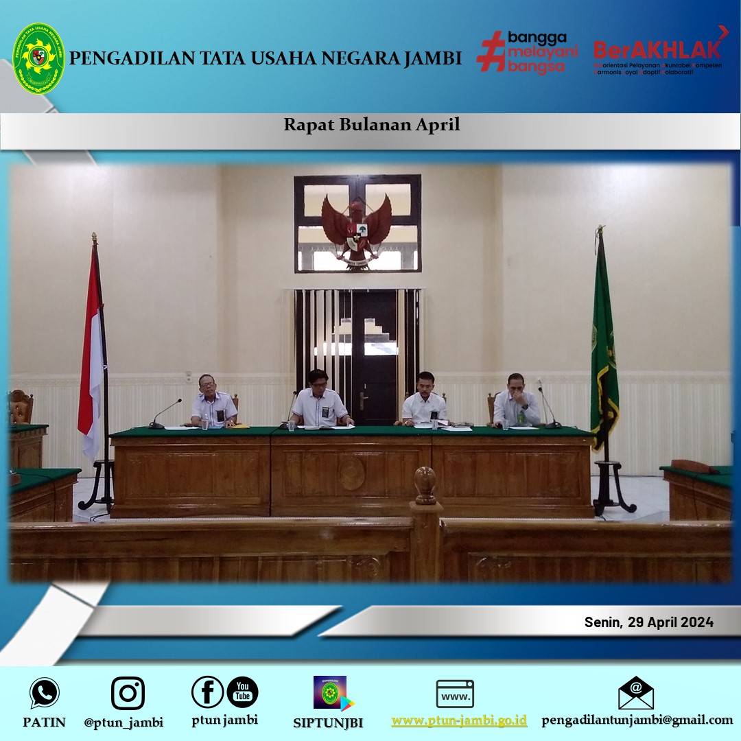 Ketua Pengadilan Tata Usaha Negara Jambi Bapak Abdullah Riziki Ardiansyah, S.H., M.H. Bersama Wakil Ketua Pengadilan Tata Usaha Negara Jambi Bapak Effendi,S.H. memimpin Rapat Bulanan pada Bulan Maret 2024. Dalam Rapat Bulanan ini, Bapak Ketua Menerima Laporan Kinerja dan Kendala dalam melaksanakan tugas dari setiap bagian. dan menanggapi seluruh laporan kinerja maupun kendala yg dihadapi dalam pelaksanaan tugas.