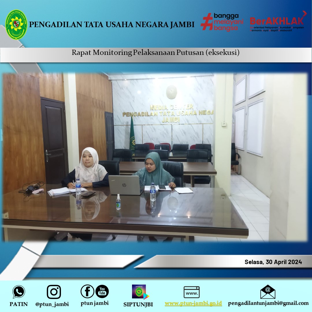 Panitera Muda Perkara Pengadilan Tata Usaha Negara Jambi Ibu IIN RAHMAWATI, S.H., M.H. dan Saudari Eka Hernani Berserta Tim IT PTUN Jambi Saudara ALVIN BAGUS SETYAWAN, S.T. Mengikuti secara daring kegiatan Monitoring Pelaksanaan Putusan (eksekusi) di Lingkungan Peradilan Tata Usaha Negara melalui Aplikasi Monekstun.