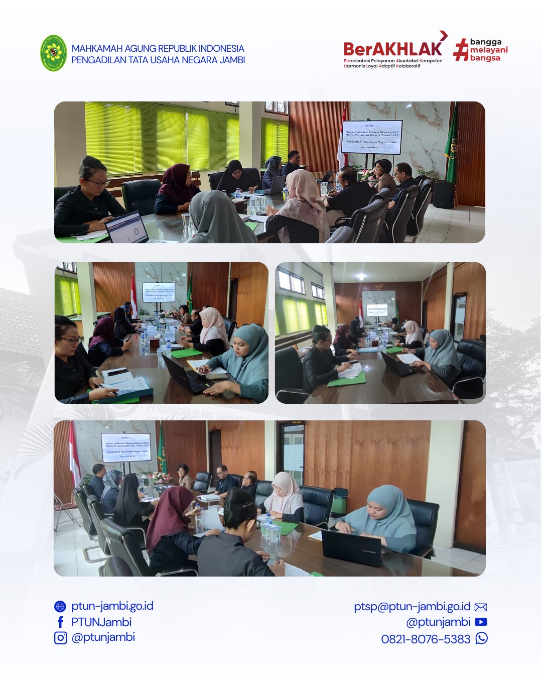 Pengadilan Tata Usaha Negara (PTUN) Jambi melaksanakan Rapat Reviu Indikator Kinerja Utama (IKU) dan Reviu Perjanjian Kinerja Tahun 2025 sebagai langkah strategis dalam memastikan keselarasan target kinerja dengan rencana pembangunan kelembagaan di tahun mendatang. Kegiatan ini bertujuan untuk mengevaluasi capaian, menyesuaikan indikator, serta merumuskan strategi yang lebih efektif dan terukur demi peningkatan kualitas penyelenggaraan peradilan.