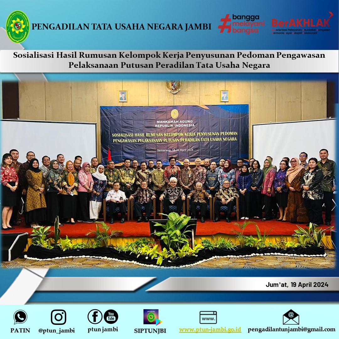 Mengikuti Kegiatan Sosialisasi Hasil Rumusan Kelompok Kerja Penyusunan Pedoman Pengawasan Pelaksanaan Putusan Peradilan Tata Usaha Negara, Kegiatan ini dilaksanakan di Semarang pada tanggal 18-20 April 2024.