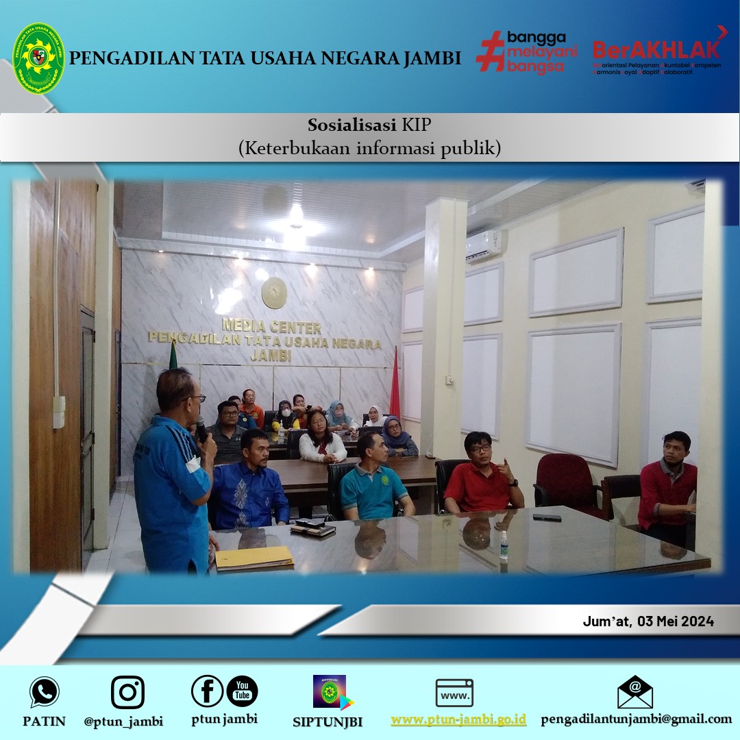 Pengadilan Tata Usaha Negara Jambi Melaksanakan Sosialisasi KIP (Keterbukaan Informasi Publik). Dalam Kegiatan ini Panitera PTUN Jambi Bapak DANIEL HASIHOLAN SIAGIAN, S.H. sebagai Pemateri. Kegiatan ini diikuti oleh Ketua, Wakil Ketua, Para Hakim, Sekretaris, Para Panitera Muda, Para Kepala Subbagian, Petugas Layanan Informasi dan Petugas PTSP.