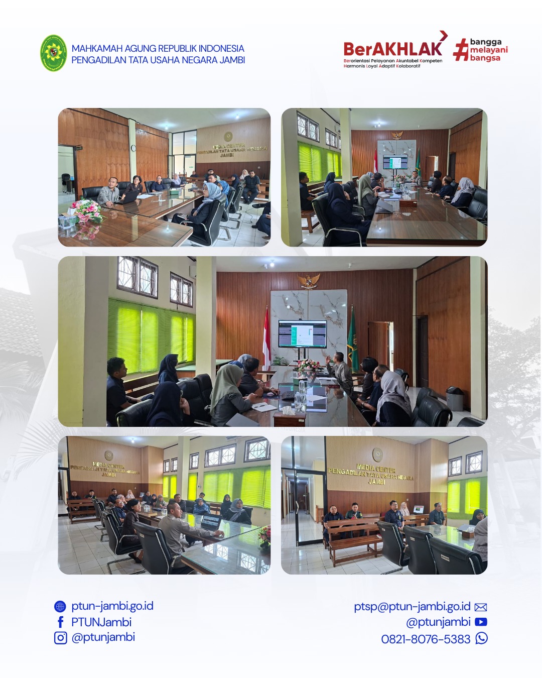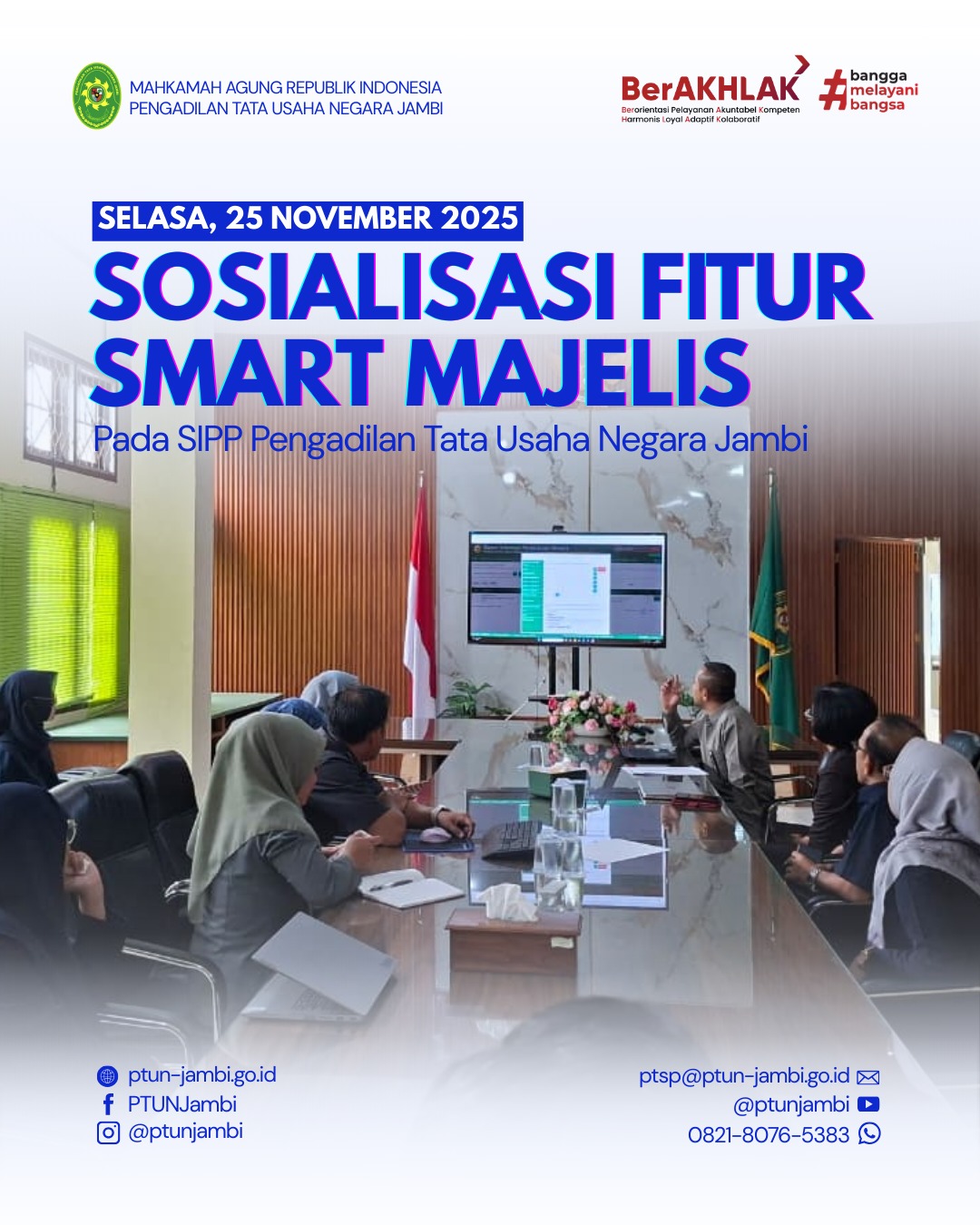 Para Hakim, Panitera, para Panitera Muda, para Panitera Pengganti, serta para Admin SIPP Pengadilan Tata Usaha Negara Jambi mengikuti Sosialisasi Smart Majelis sebagai upaya peningkatan kompetensi dan optimalisasi pemanfaatan teknologi informasi dalam proses penyelenggaraan peradilan.