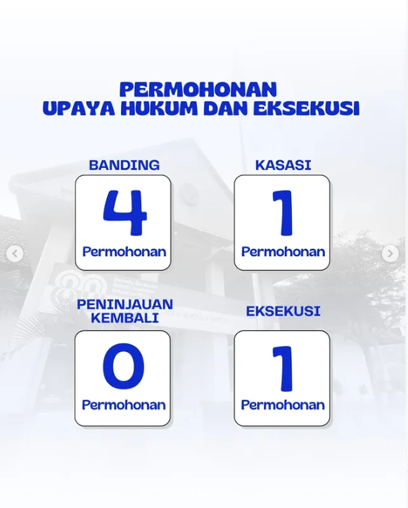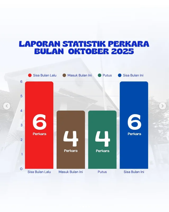 Pada periode ini, jumlah perkara yang masih berjalan sebanyak 6 perkara. Dari jumlah tersebut, 4 Perkara masuk, 4 perkara telah diputus dan 6 perkara masih dalam proses persidangan.