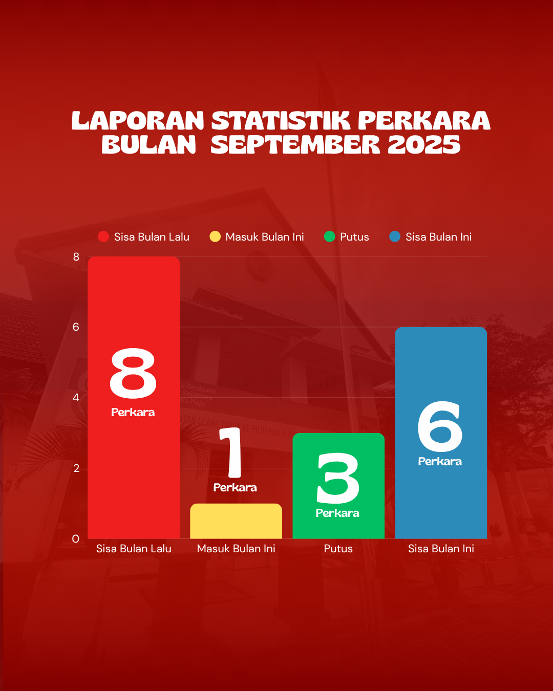 Pada periode ini, jumlah perkara yang masih berjalan sebanyak 8 perkara. Dari jumlah tersebut, 1 Perkara masuk, 3 perkara telah diputus dan 6 perkara masih dalam proses persidangan.