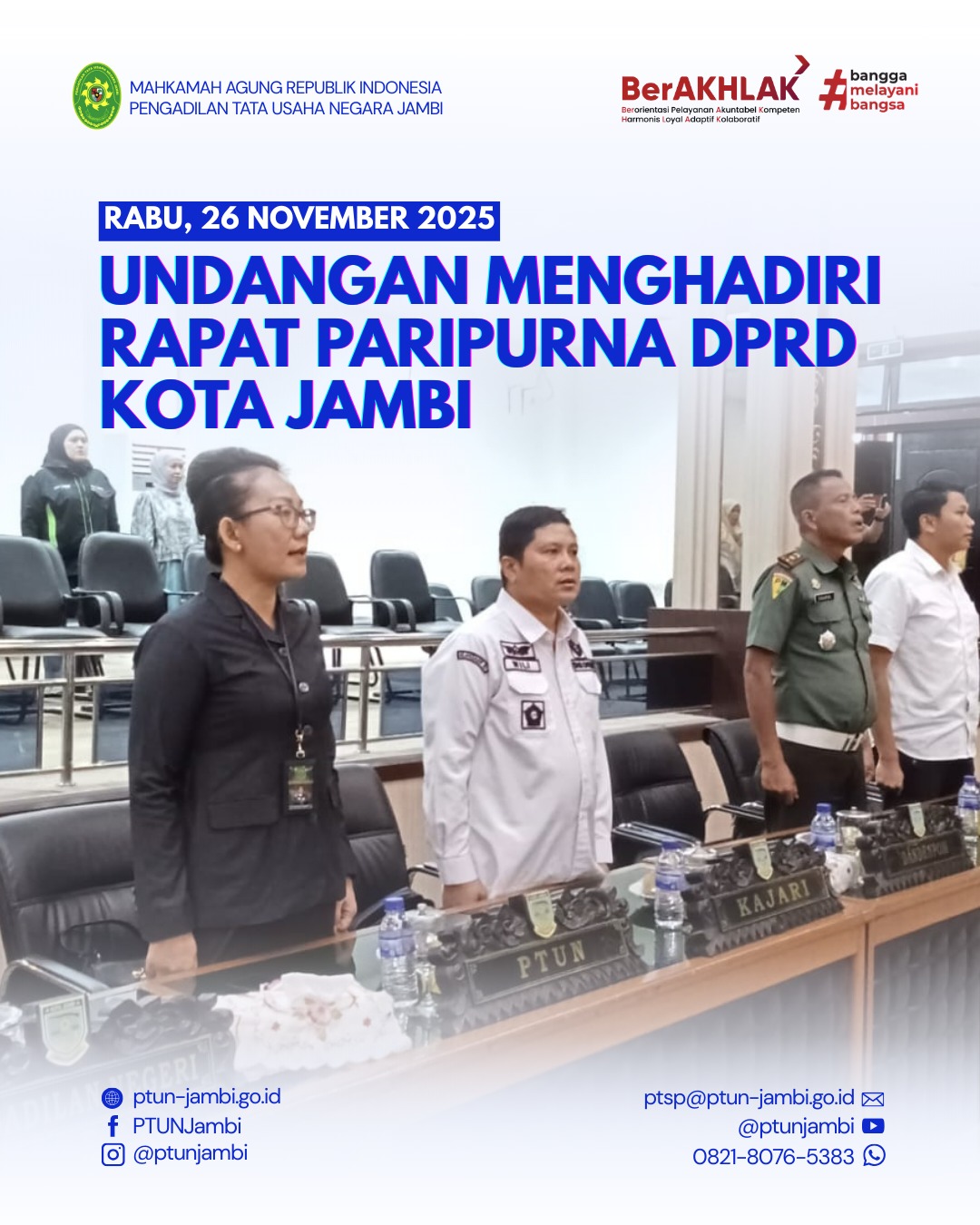 Pengadilan Tata Usaha Negara (PTUN) Jambi diwakili oleh Ibu Fransisca Hutagalung, S.E., menghadiri Rapat Paripurna DPRD Kota Jambi yang dilaksanakan pada Rabu, 26 November 2025 pukul 10.00 WIB bertempat di Ruang Swarna Bumi DPRD Kota Jambi. Kehadiran ini merupakan bentuk partisipasi PTUN Jambi dalam mendukung proses legislasi daerah yang berhubungan dengan peningkatan kualitas penyelenggaraan pemerintahan.